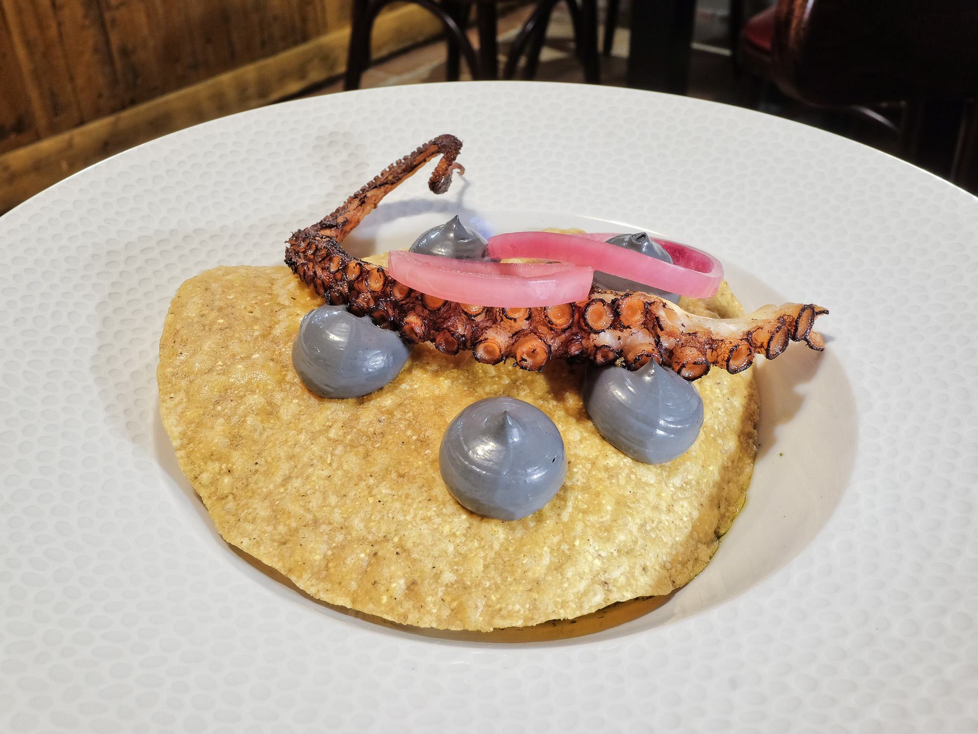 Das Garnelen Tatar bestand überwiegend aus Oktopus (etwas Garnelen ähnliches habe ich jedenfalls nicht entdeckt), Weintrauben, und etwas Minz Öl. Dazu gab es einen krossen Mais Tortilla, einen kleinen Oktopus Arm, Chipotle Mayonnaise und sauer eingelegte Zwiebelringe. Sehr lecker.