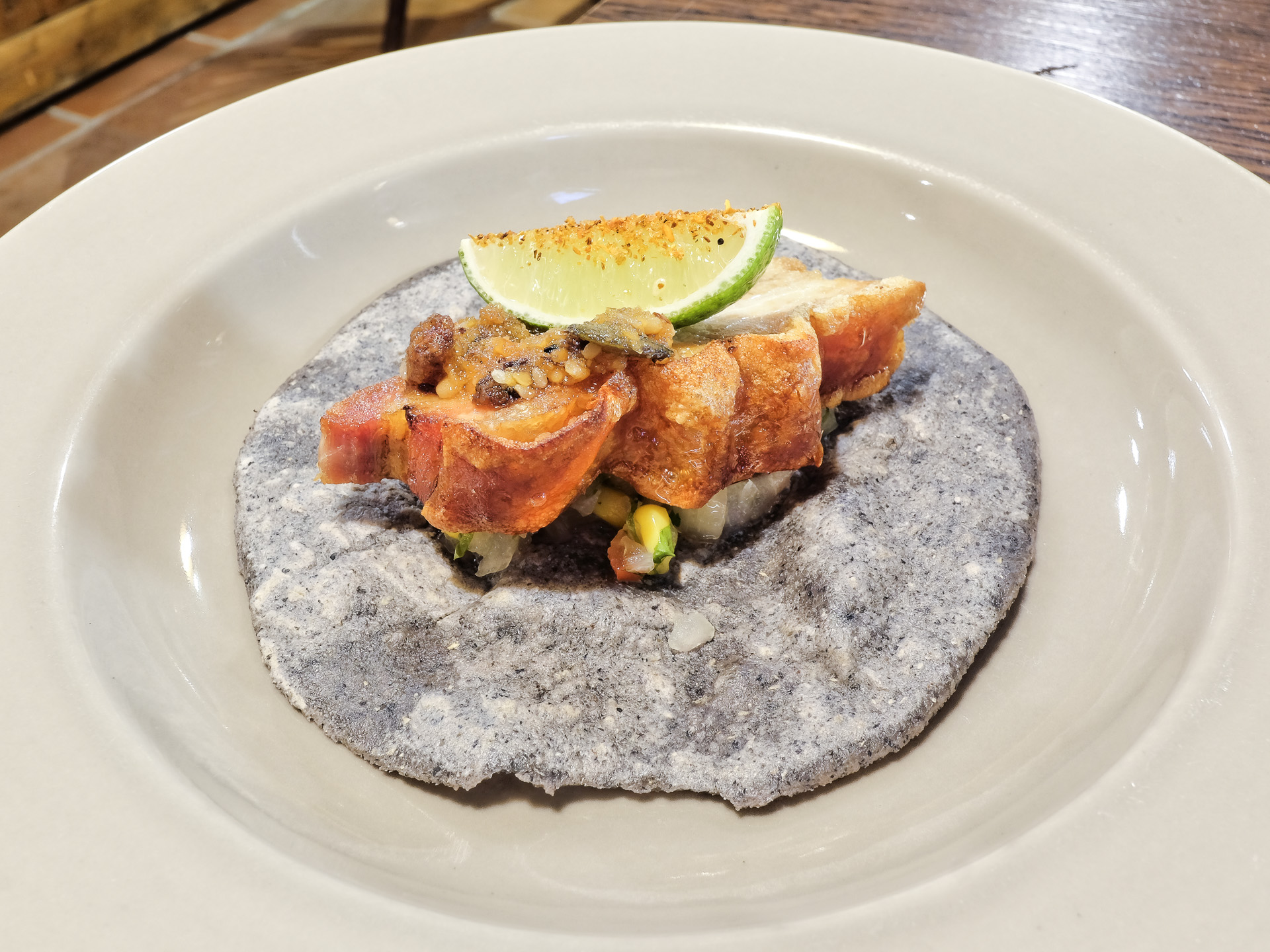 Der gegrillte Schweinebauch war zart und hatte ein feines Aroma, die Schwarte war kross. Dazu gab es einen Mais Tortilla, eine Macha Sauce und Chalaquita. Sehr lecker.