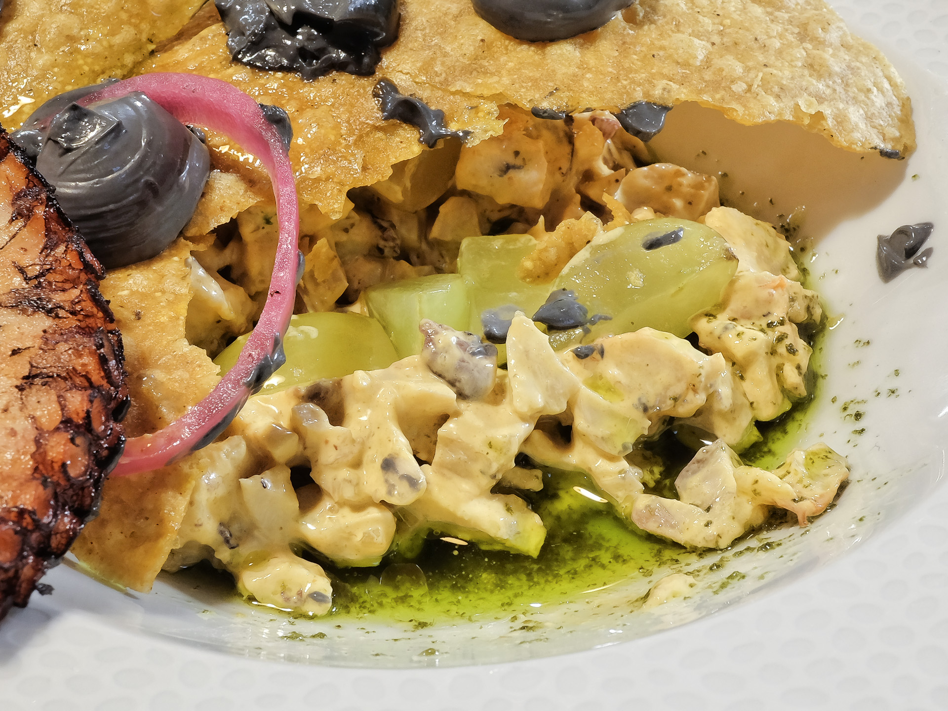 Garnelen-Tartar mit Oktopus, Chipotle-Mayonnaise, grünen Trauben, Minzöl und knusprigen Mais-Tortillas