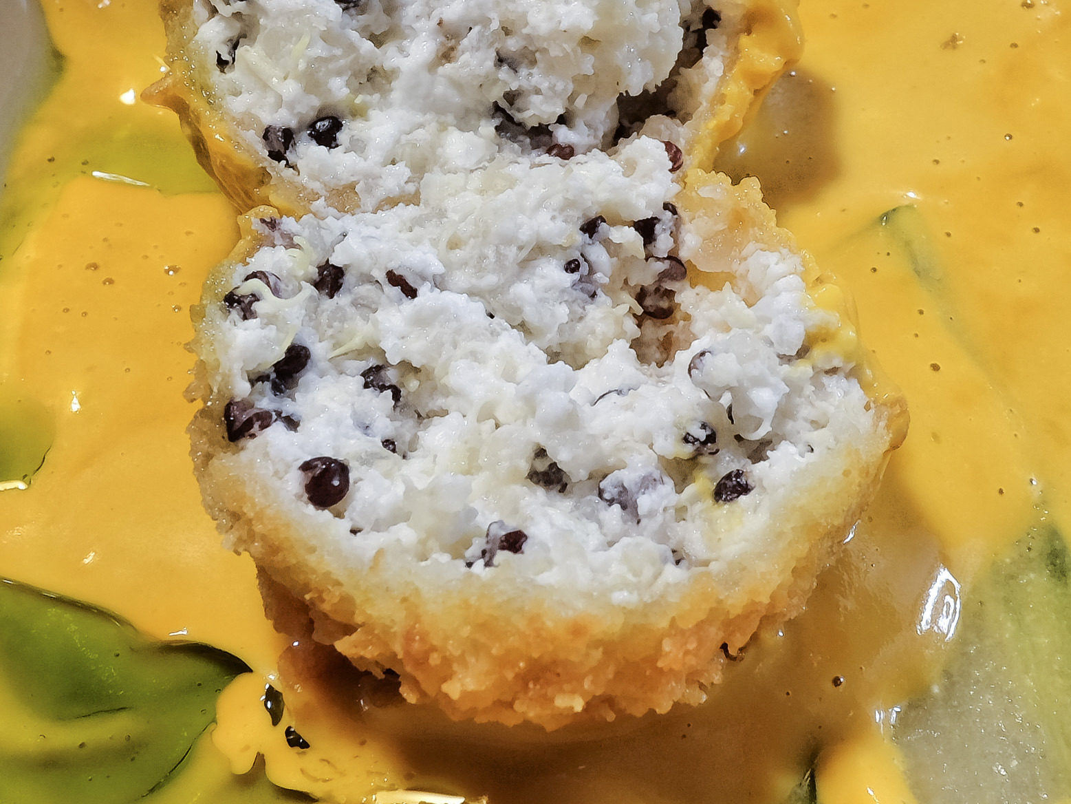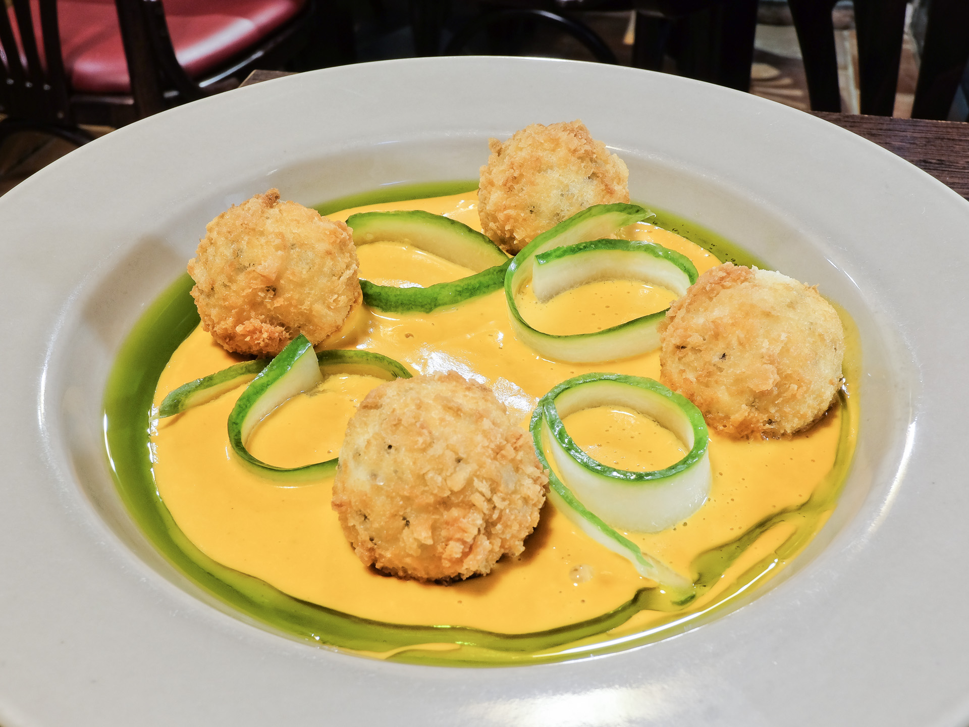 Die Kroketten aus Ziegenkäse und Quinoa waren zart und hatten ein feines Aroma. Dazu gab es Gurkenscheiben und eine cremige, leicht pikante Sauce mit Cashewnüssen, Chilis und Tomaten. Sehr lecker.