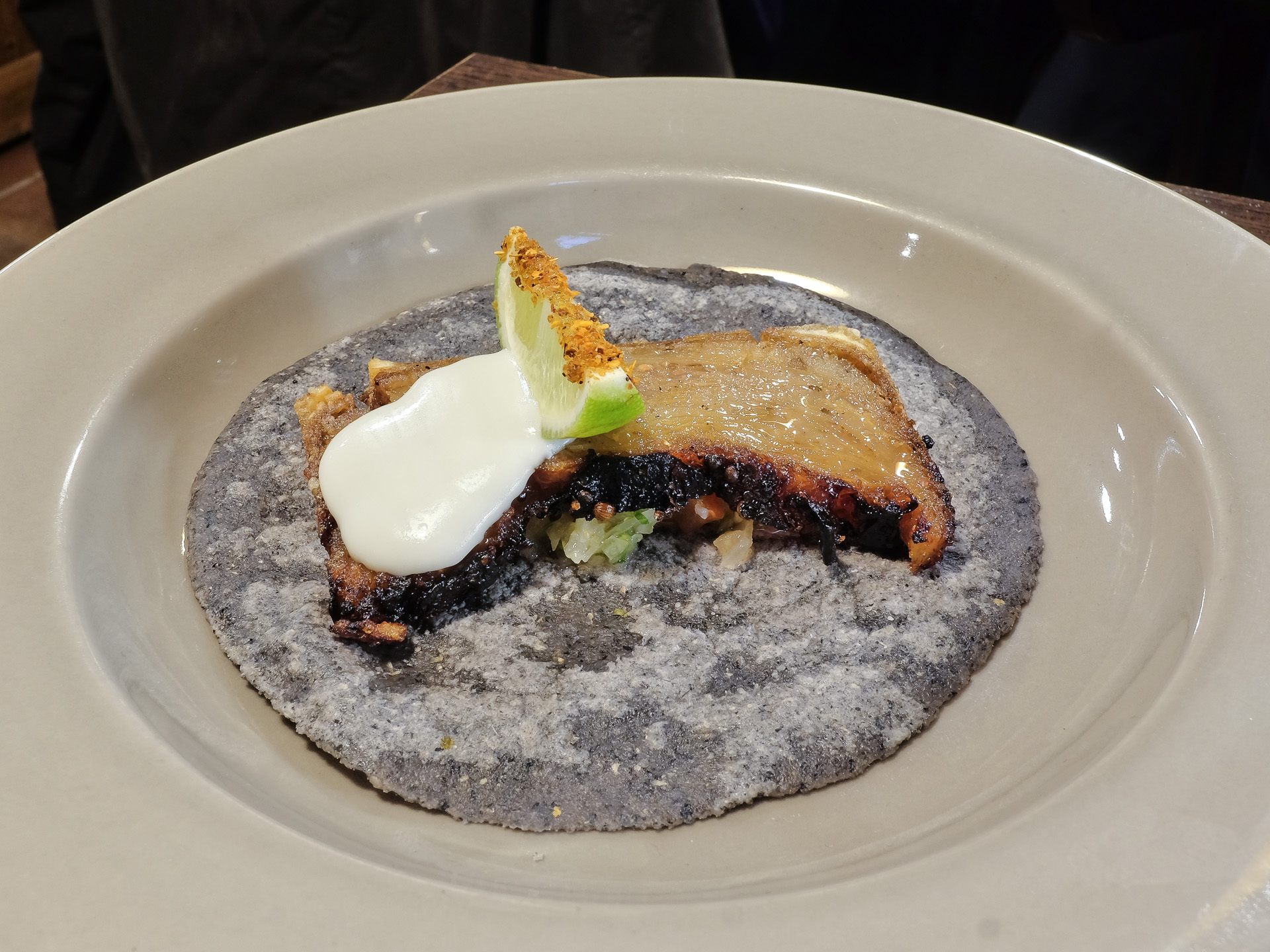 Bei diesem Gericht handelte es sich nicht um Schweinebauch sondern um ein Produkt aus Äpfeln. Die Äpfel waren in dünnen Scheiben angerichtet, die so etwas an Schweinebauch erinnterten, aussen waren sie leicht kross. Dazu gab es eine Mais Tortilla, Pico de Gallo und ein Apfel Aioli. Ein originelles Gericht, sehr lecker.