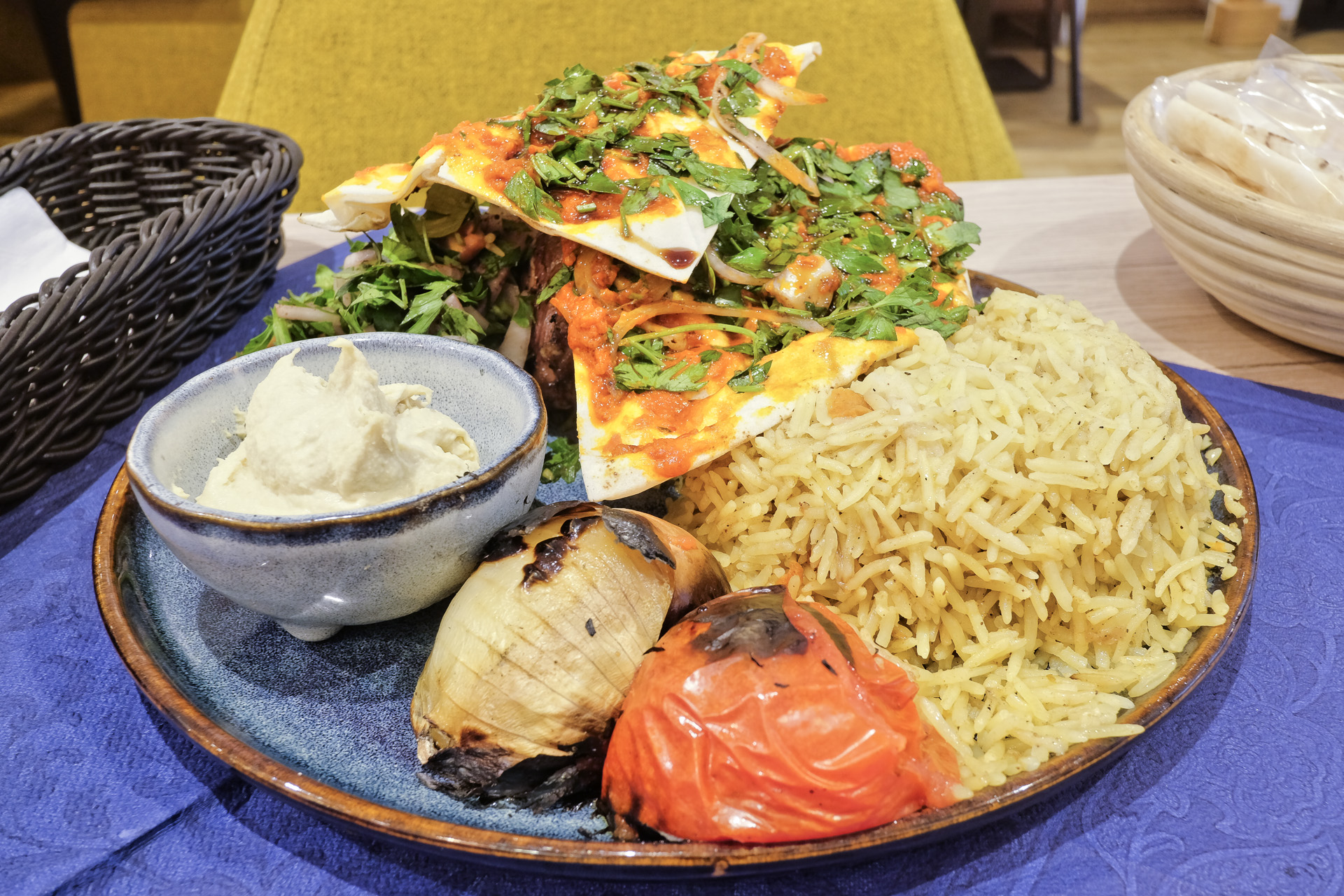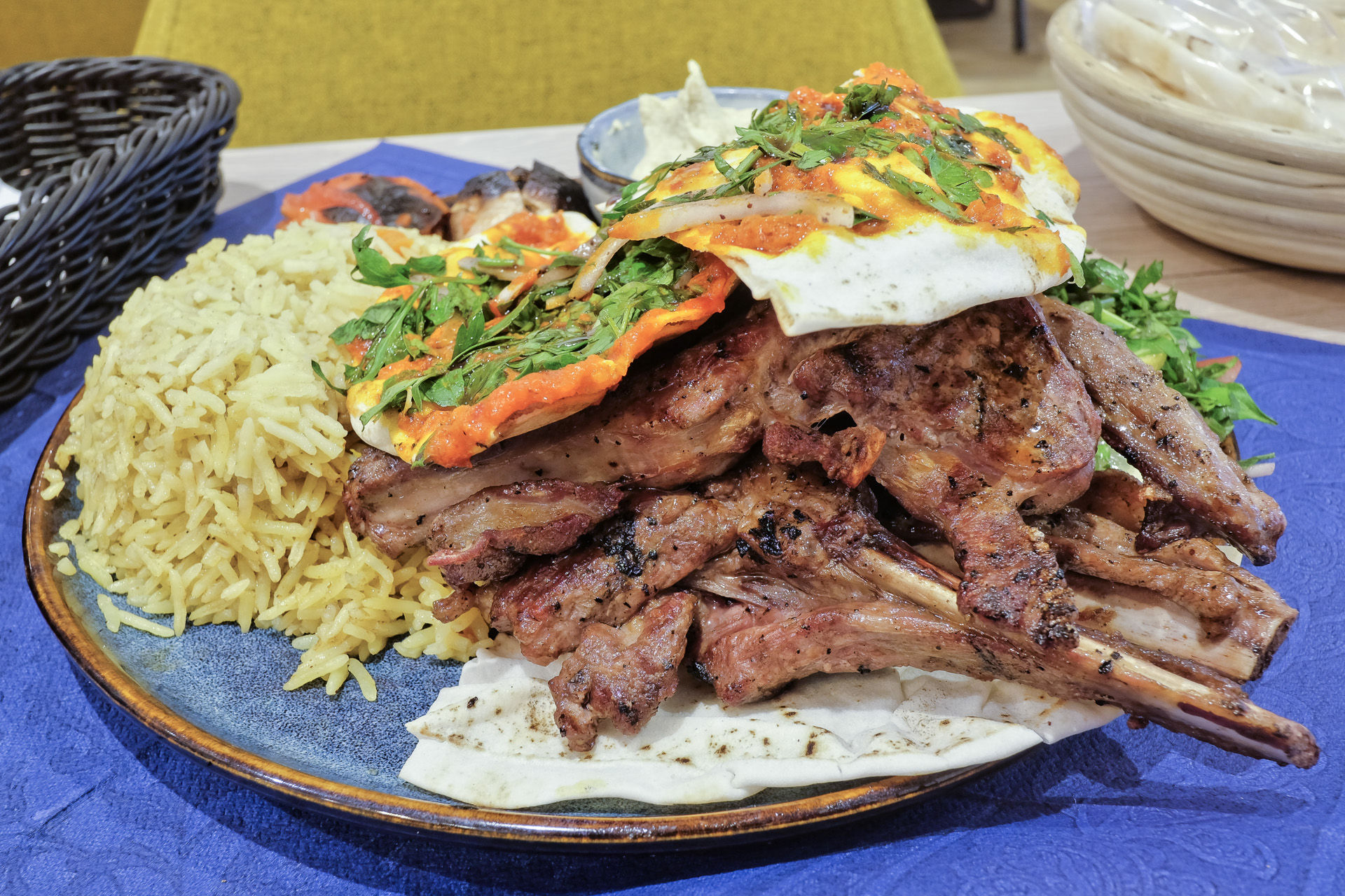 Die Lammkoteletts waren ungleichmäßg geschnitten und teilweise recht zäh, auch das Lammaroma war nicht sehr ausgeprägt (ganz lecker). Dazu gab es aromatisch gewürzten Reis, eine halbe gegrillte Tomate und Zwiebel, einen Petersilien Salat mit Tomaten und Zitrone (eine Art Taboule), etwas aromatisches Hummus und etwas belegtes Fladenbrot. Bis auf die Lammkoteletts sehr lecker.