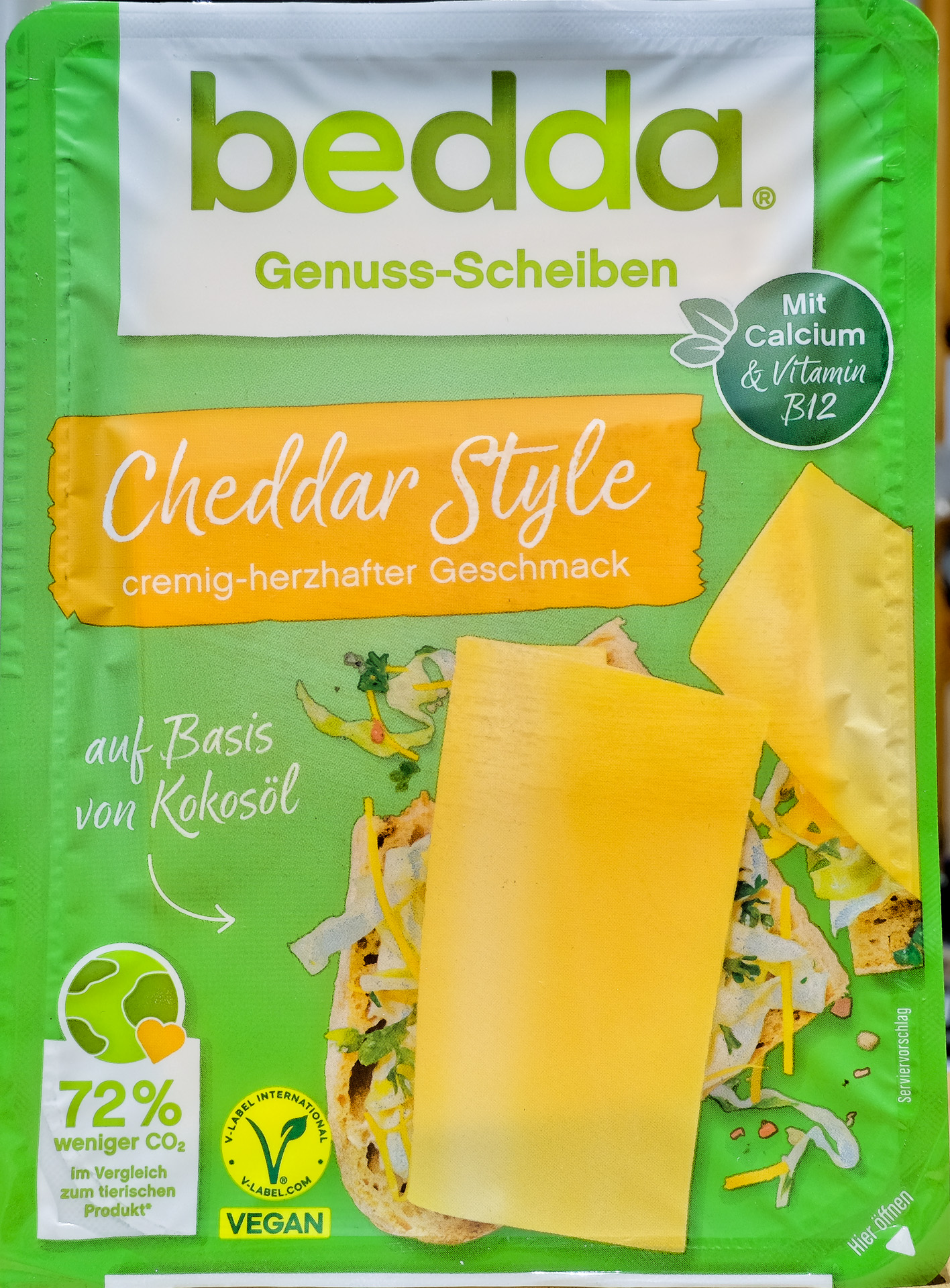 Vegane Käse Alternative auf Basis von Kokosöl mit Cheddar Geschmack, angereichert mit Calcium und Vitamin B12 (Zitat Bedda).
