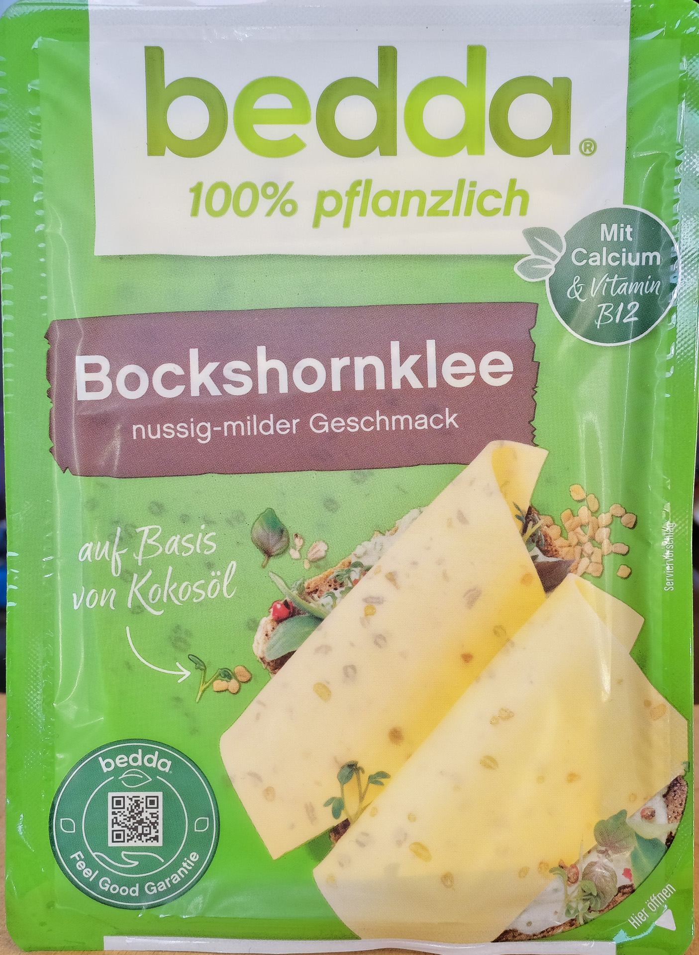 Vegane Käse Alternative auf Basis von Kokosöl mit Bockshornkleesamen, angereichert mit Calcium und Vitamin B12 (Zitat Bedda).