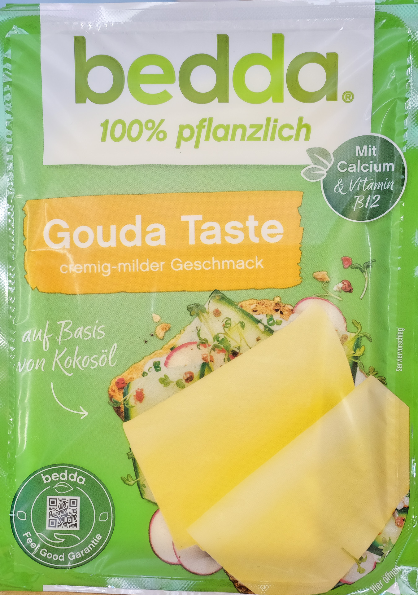 Vegane Käse Alternative auf Basis von Kokosöl mit Gouda Geschmack, angereichert mit Calcium und Vitamin B12 (Zitat Bedda).