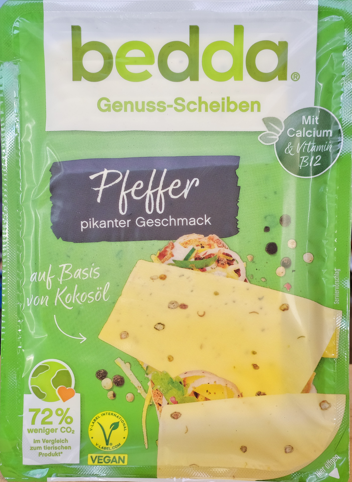 Vegane Käse Alternative auf Basis von Kokosöl mit Pfeffer, angereichert mit Calcium und Vitamin B12 (Zitat Bedda).