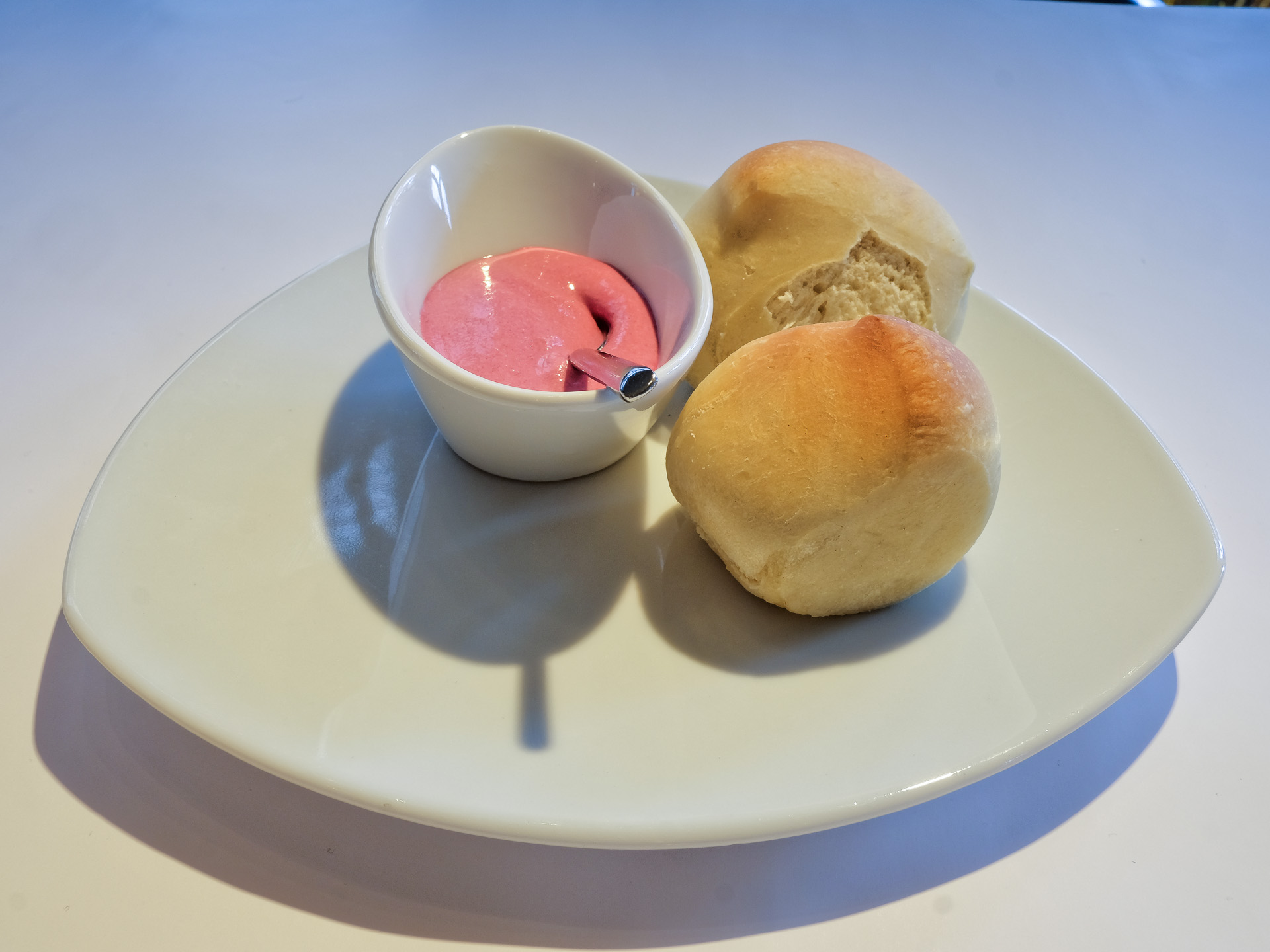 Vor dem Menü wurden frische warme Brötchen mit einem Rote Beete Meerrettich Dip gereicht. Sehr lecker, daran hat sich in 15 Jahren nichts geändert, auch die Teller sind gleich geblieben.