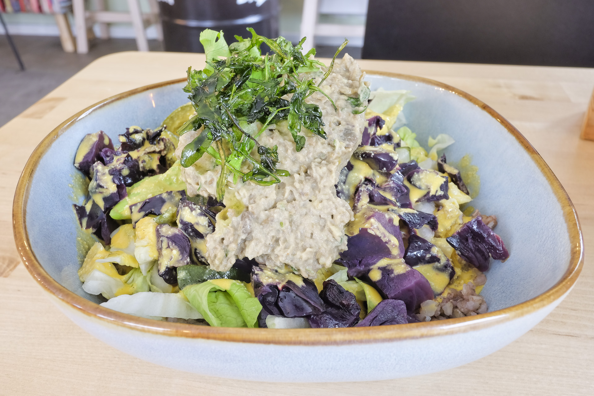 Die Bowl bestand aus Buchweizen, Eisbergsalat, einem Linsen Püree, im Ofen gegarten Zucchini, gebackenen Rotkohl, Petersilie, frittierten Rucola und ein fruchtig säuerliches Sanddorn Dressing. Eine schöne Kombination warmer und kalter Komponenten, geschmacklich aber etwas eintönig. Gerade noch sehr lecker.