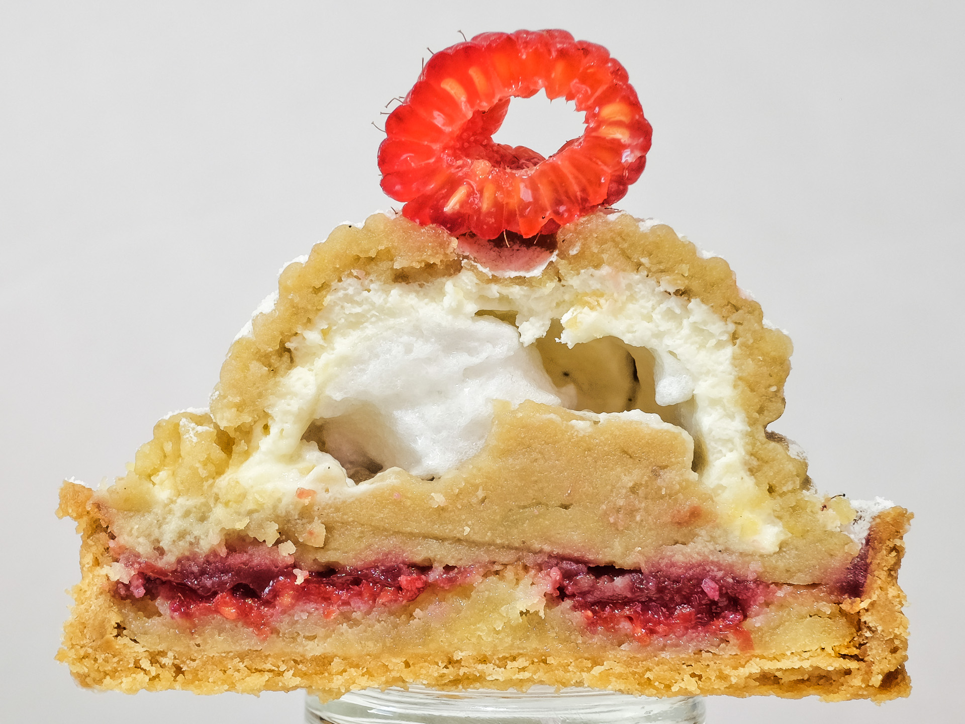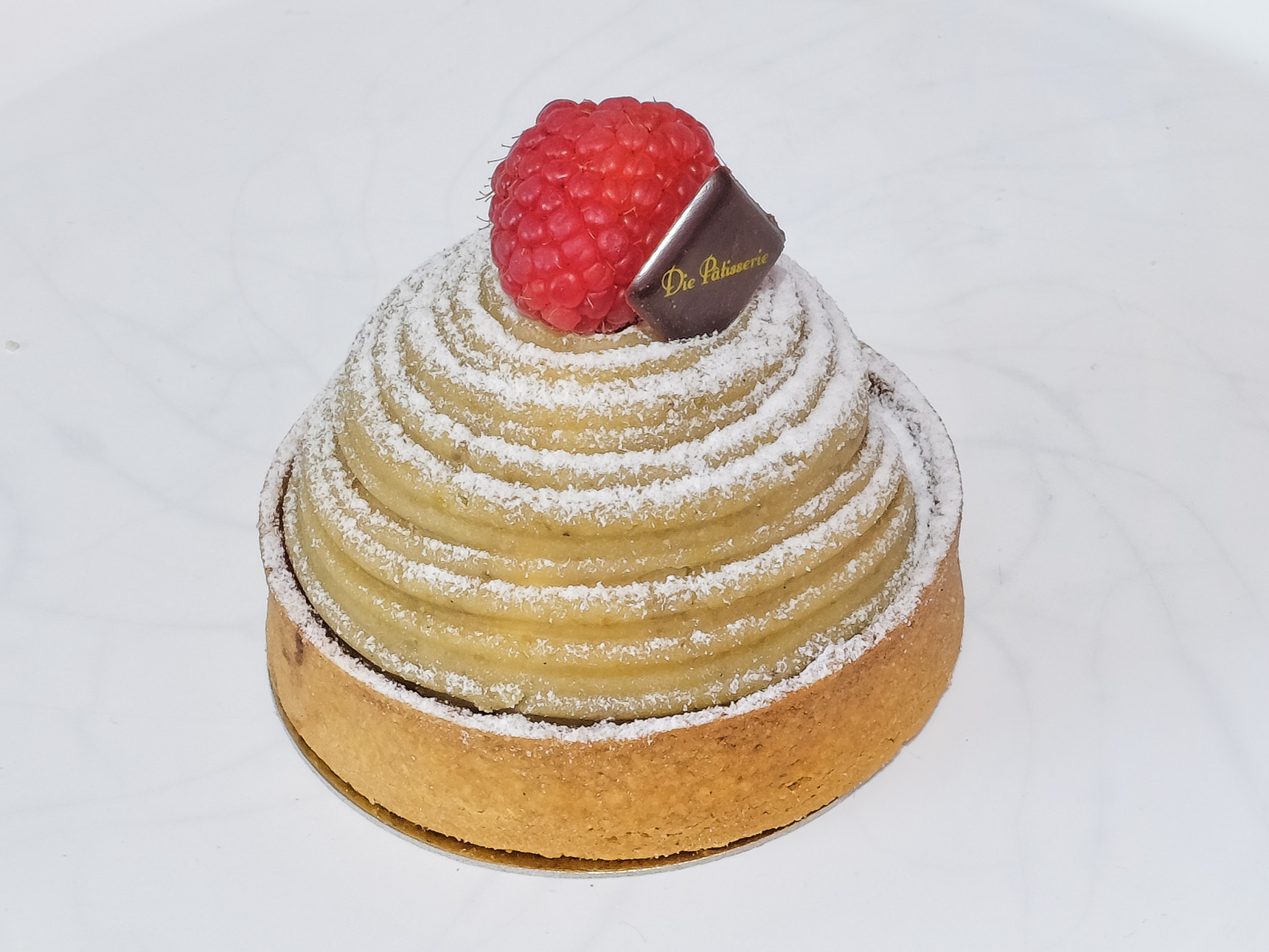 Er sieht nicht nur schick aus, er hat auch geschmackvolle Schichten in sich. Ein Tartelette, der mit einer Mandelcreme und Himbeeren sowie auch einer Konfitüre gefüllt ist. Eine Maronen Creme oben und in sich versteckt luftige Sahne in einem Kern aus Baiser. (Zitat Die Patisserie)