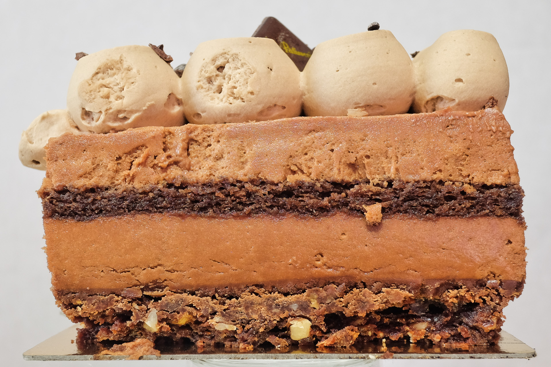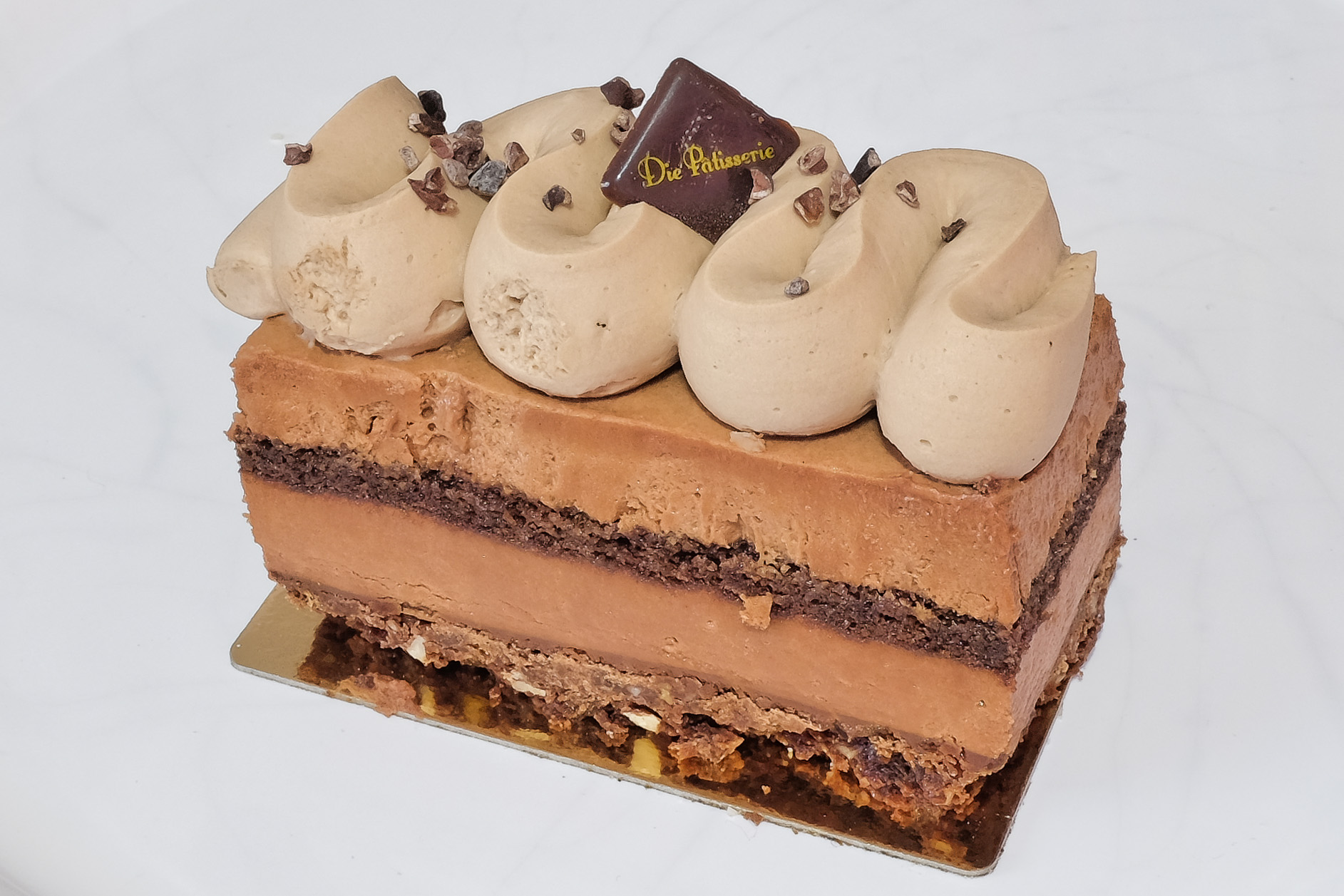 Schön akkurat zeigt sich unser Reve Choco. Geschichtet ist er mit einem Schoko-Mürbeteig, der bestrichen wird mit einer Ganache au Chocolat Valrhona, einen schon saftigen Brownie mit einem kleinen Touche de Cafe. Einen Schoko Biskuit und zu guter letzt Mousse au Chocolat. (Zitat Die Patisserie)