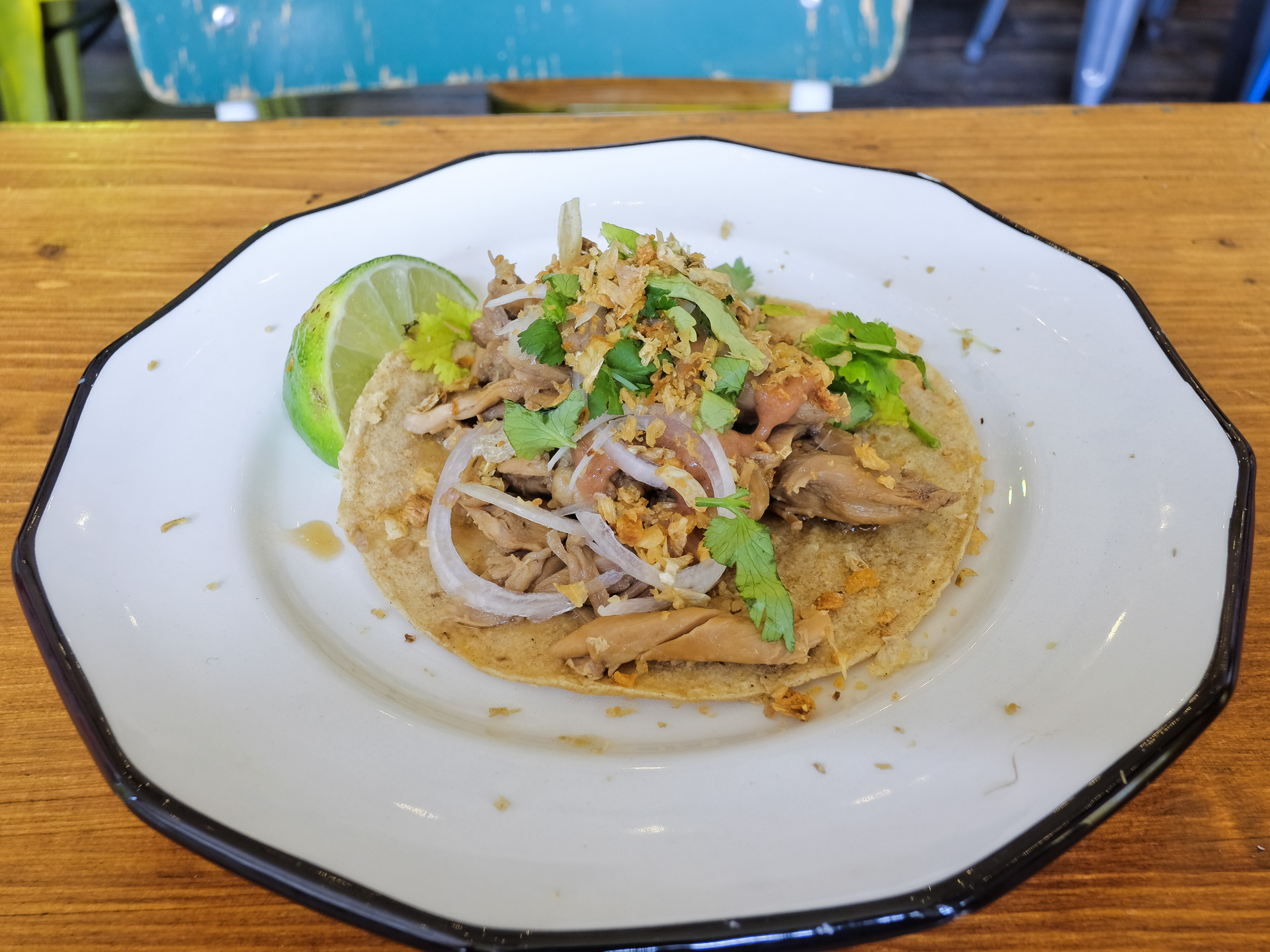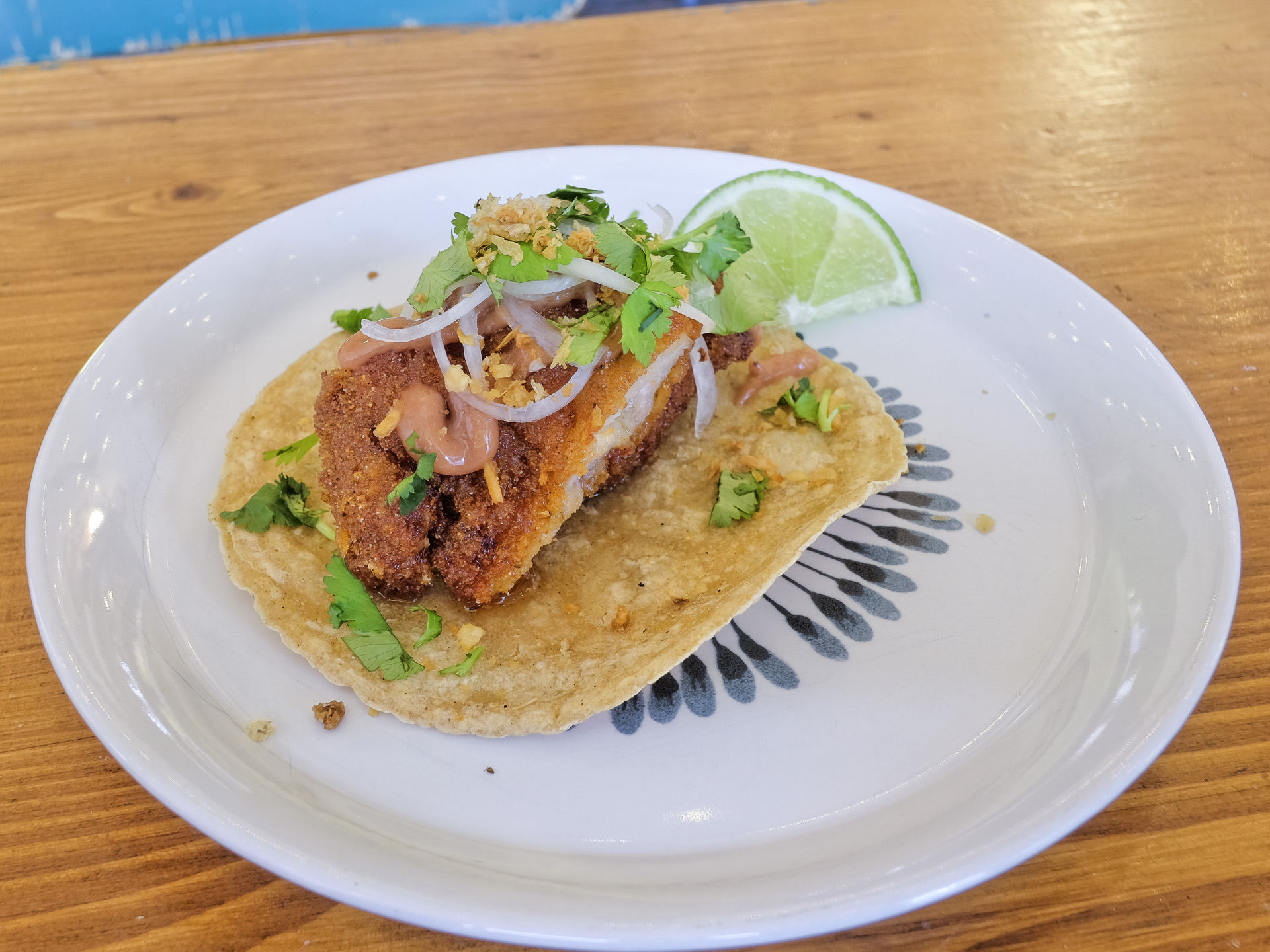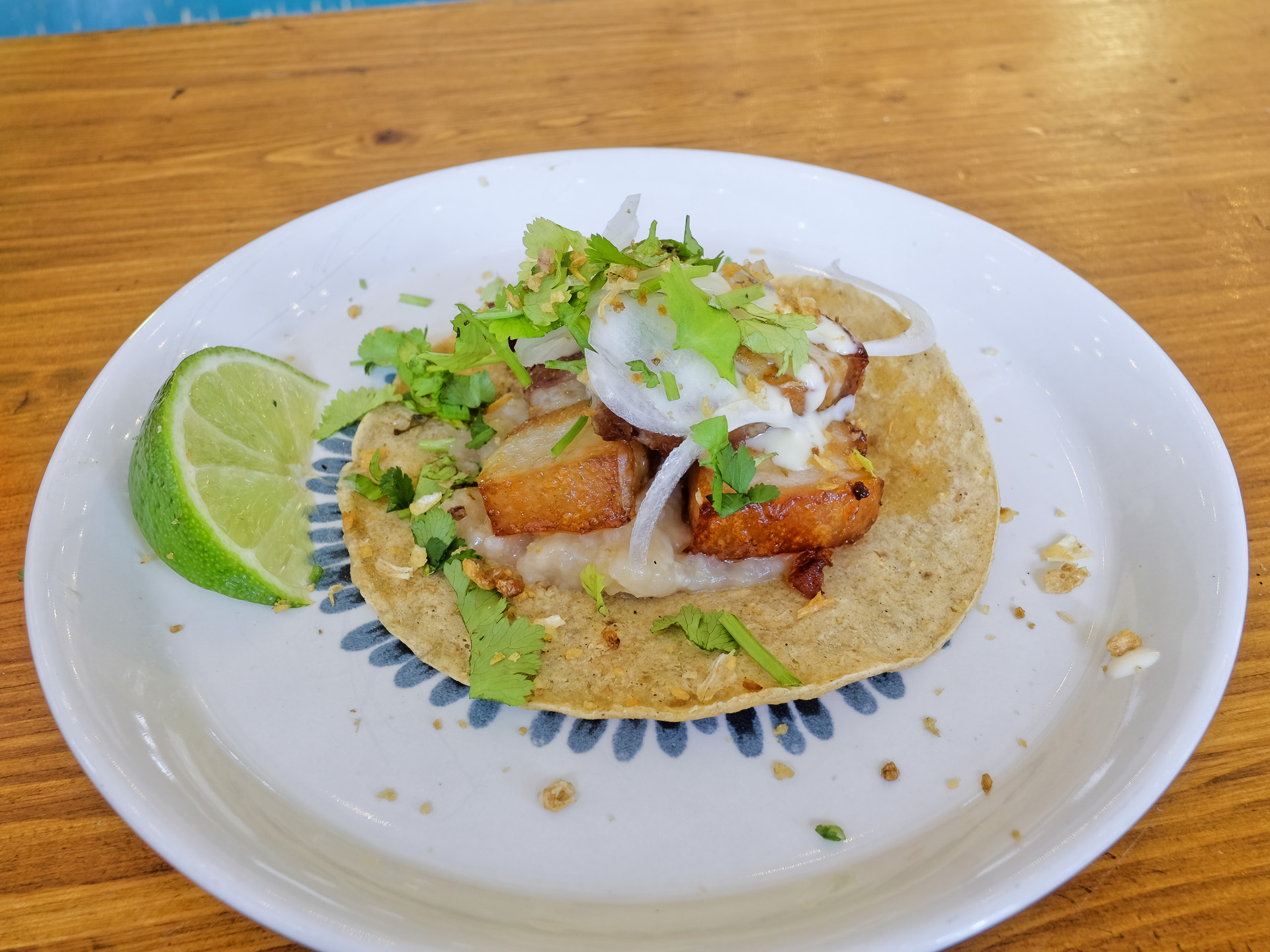 Der Tortilla Fladen hatte eine zarte Textur und ein feines Aroma, der Schweinebauch (Lechon Kawali) war zart und hatte ein feines Aroma. Dazu gab es eine Arroz Caldo Sauce, etwas Kalamansi Mayo, etwas Zwiebeln, ein paar Kräuter, ein paar Knusperelemente und ein Stück Limette. Sehr lecker.