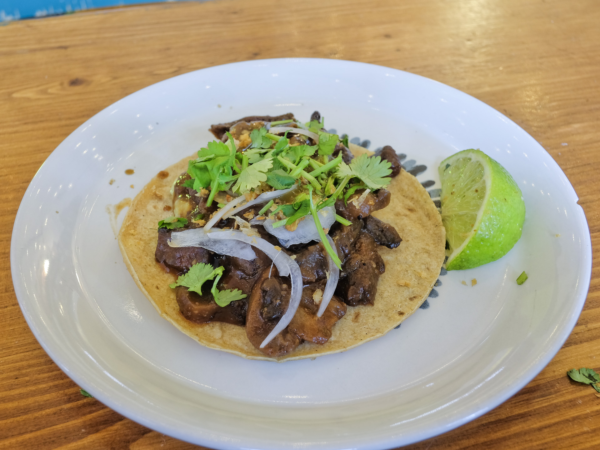 Der Tortilla Fladen hatte eine zarte Textur und ein feines Aroma, die Champignons waren sehr zart und hatten ein feines Aroma, zubereitet wurden sie mit etwas Tocino. Dazu gab es eine Mango Tamarinden Salsa, etwas Zwiebeln, ein paar Kräuter, ein paar Knusperelemente und ein Stück Limette. Der bisher beste Taco, sehr lecker, Klasse.