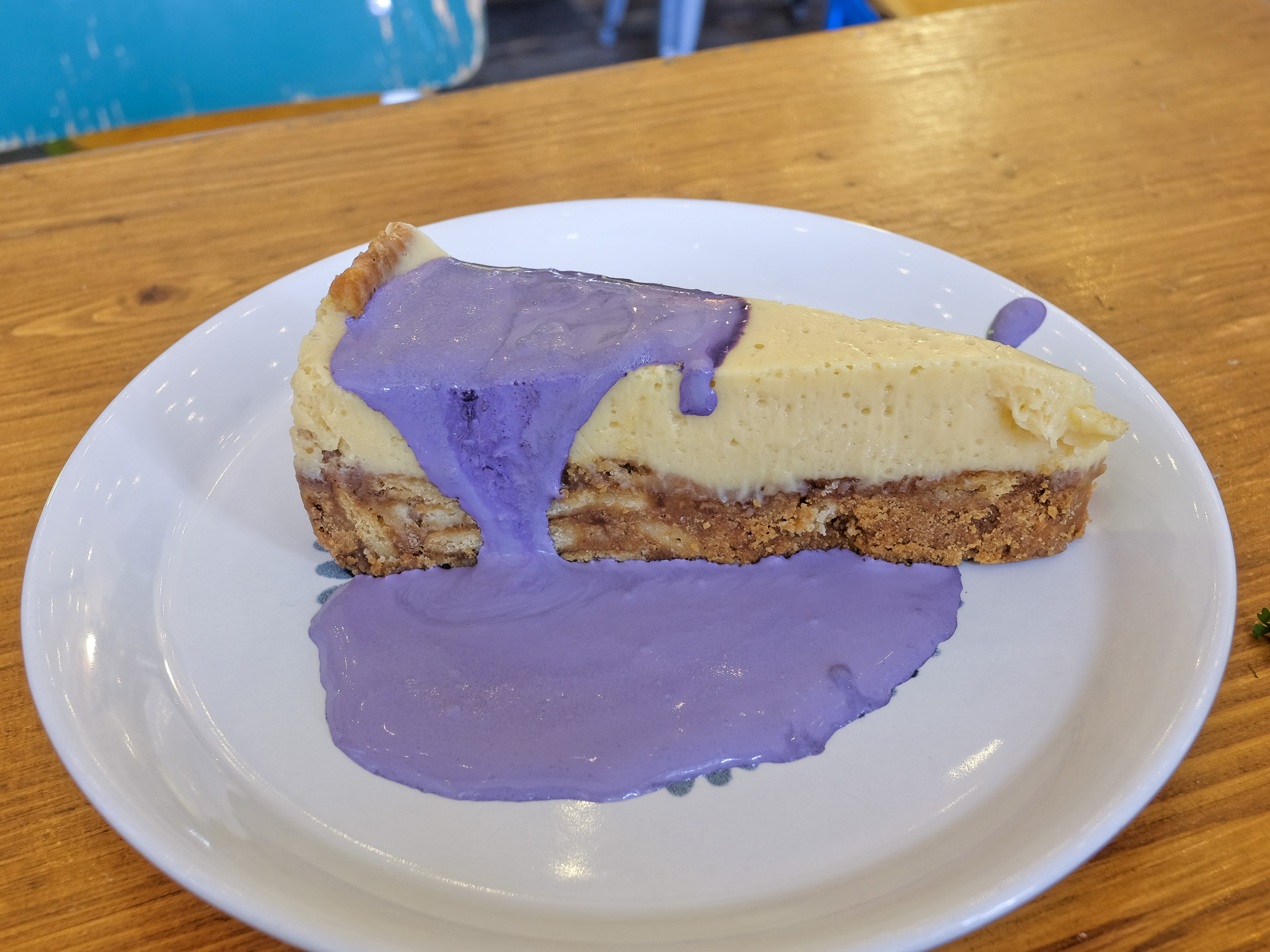 Der Kalamansi Pie hatte einen harten spröden Boden mit angenehmem Biss, die Kalamansi Füllung hatte ein feines Aroma und erinnertes an einen Käsekuchen. Dazu gab es eine violette Ube Cream. Sehr lecker.