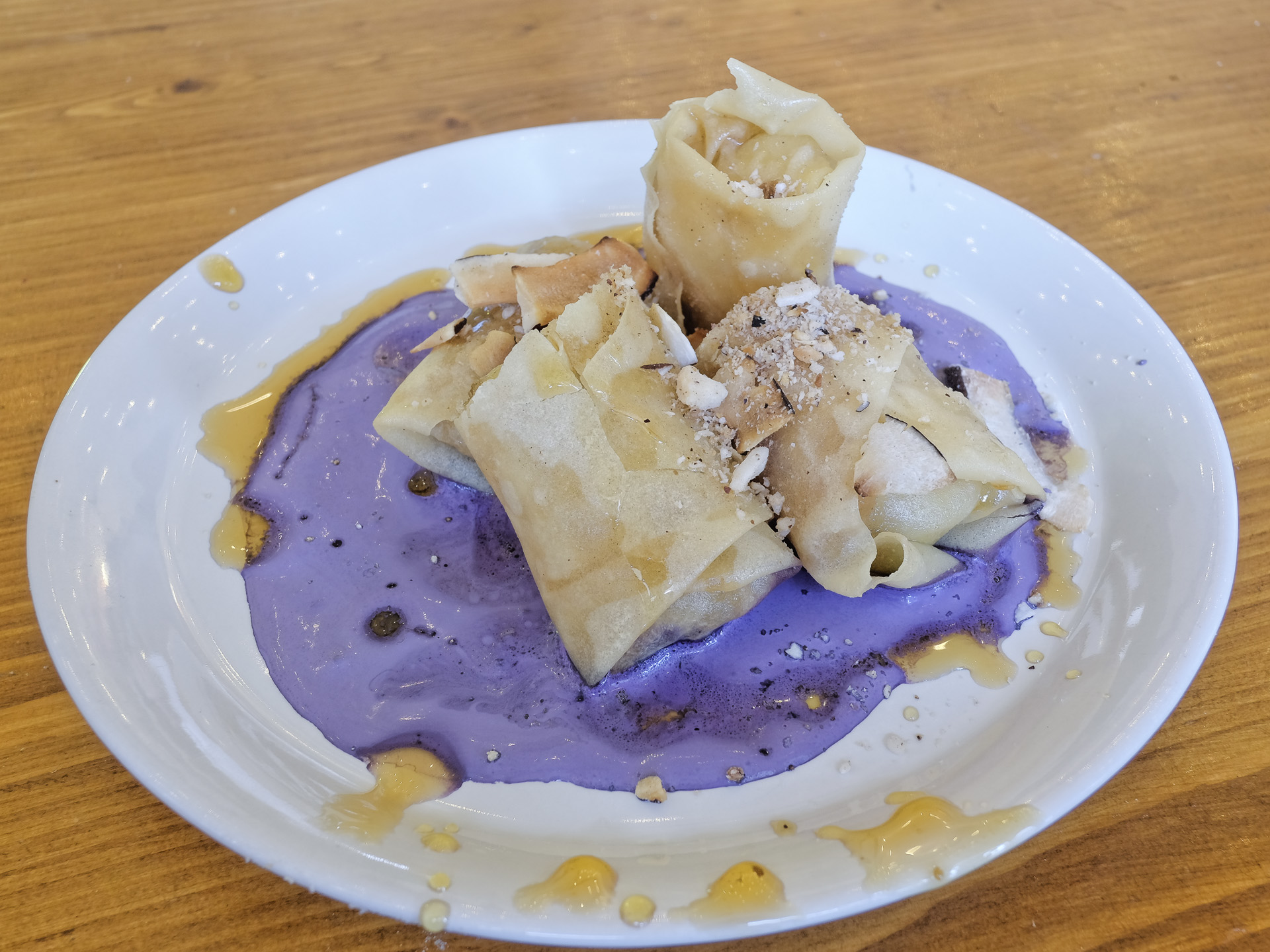 Die Banane wurde in Filoteig gewickelt und frittiert, sie war aussen knusprig und hatte ein feines Aroma. Dazu gab es eine Karamell Sauce, Ube Cream und Kokosnuß. Sehr lecker.