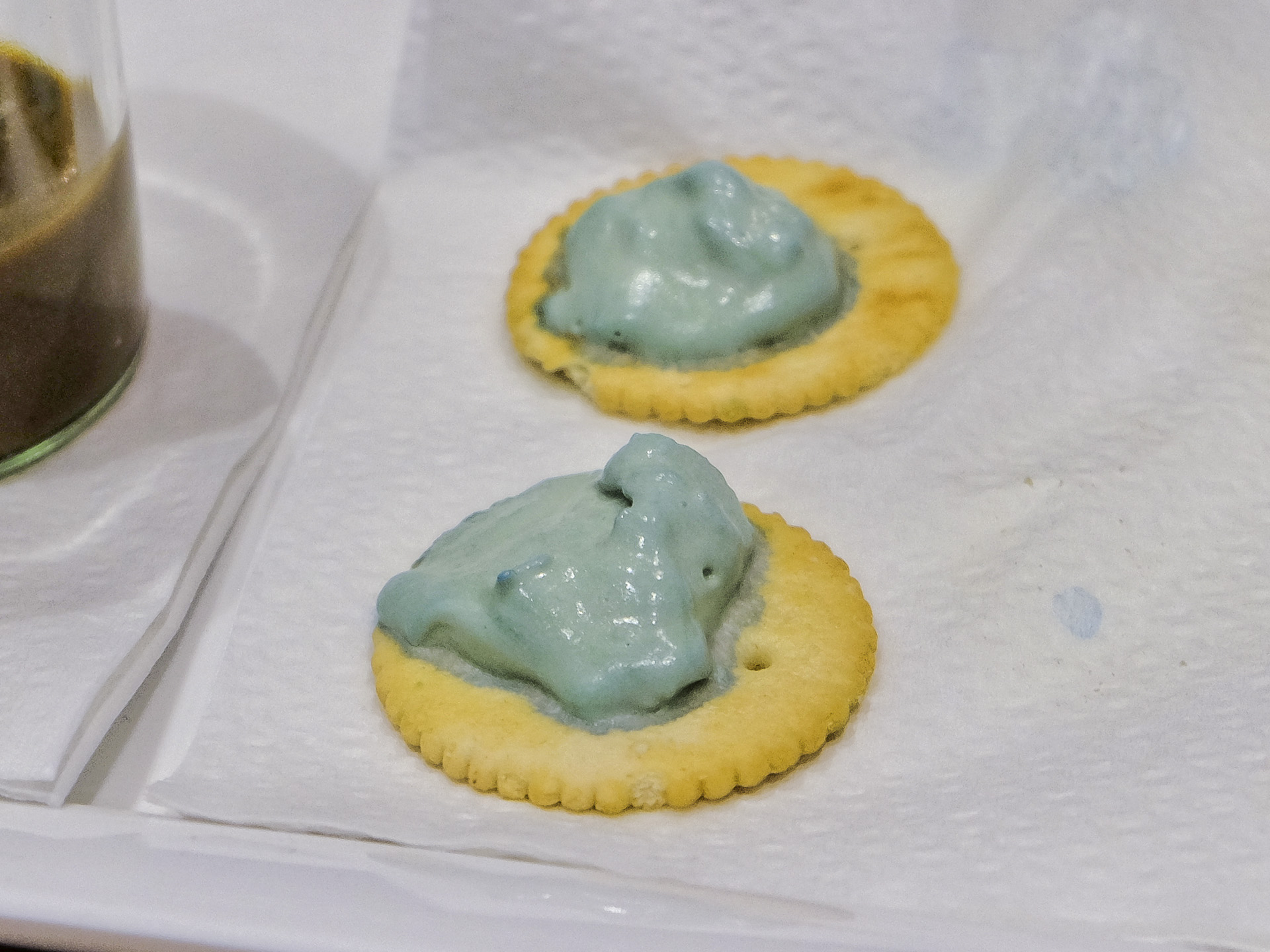 Der Frischkäse mit Spirulina Algen hatte eine leicht stumpfe Textur und ein leicht süßliches Aroma.