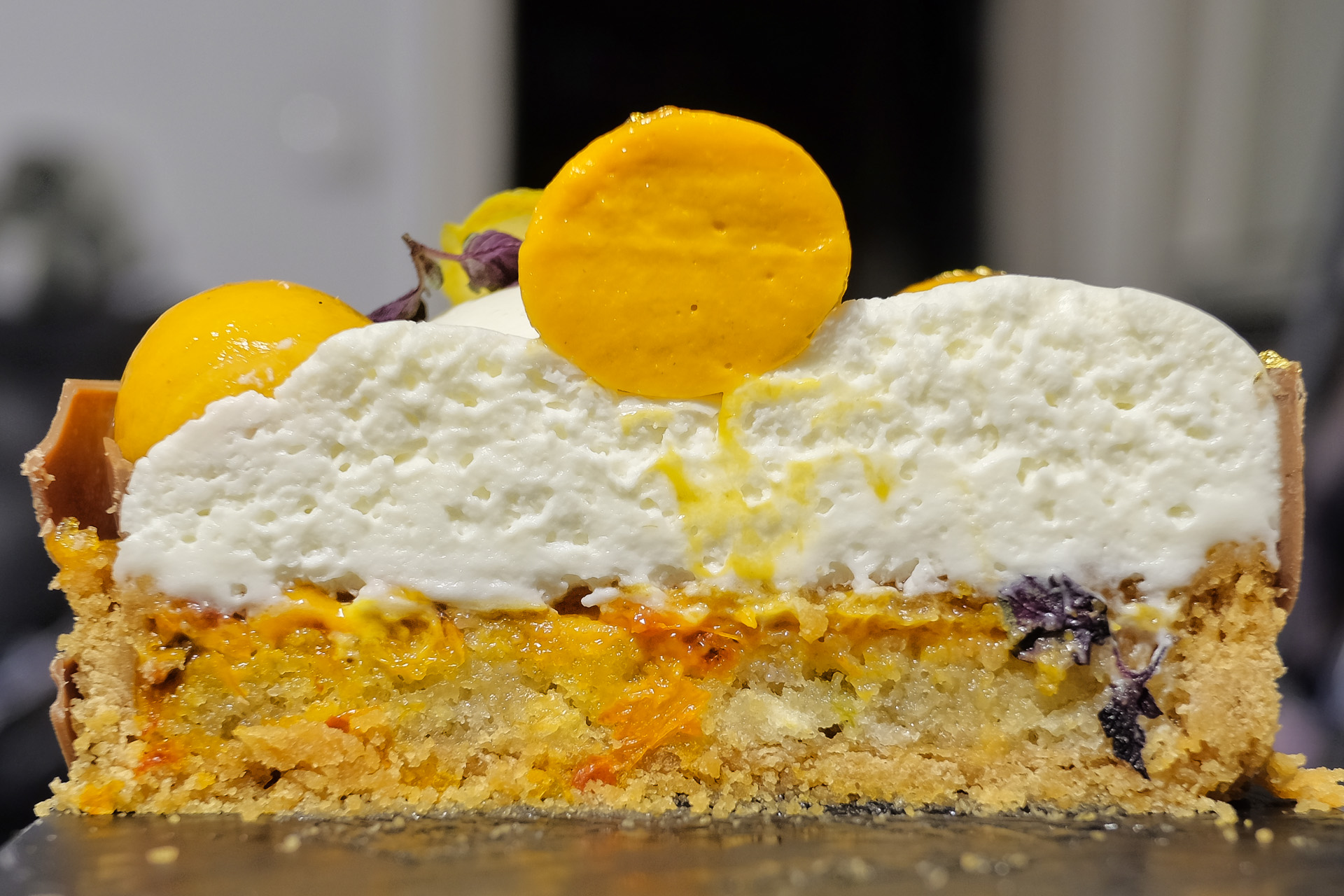 Das Törtchen hatte einen Mürbeteig Boden mit einem saftigen Rührteig, darauf war etwas Sanddorn Orangen Marmelade und eine zarte aromatische KokosnußMousse abgerichtet. Dekoriert war das Törtchen mit Kugeln aus einer fruchtig säuerlichen Sanddorn Orangen Mousse, umhüllt war es mit einer aromatischen Milchschokolade. Sehr lecker.