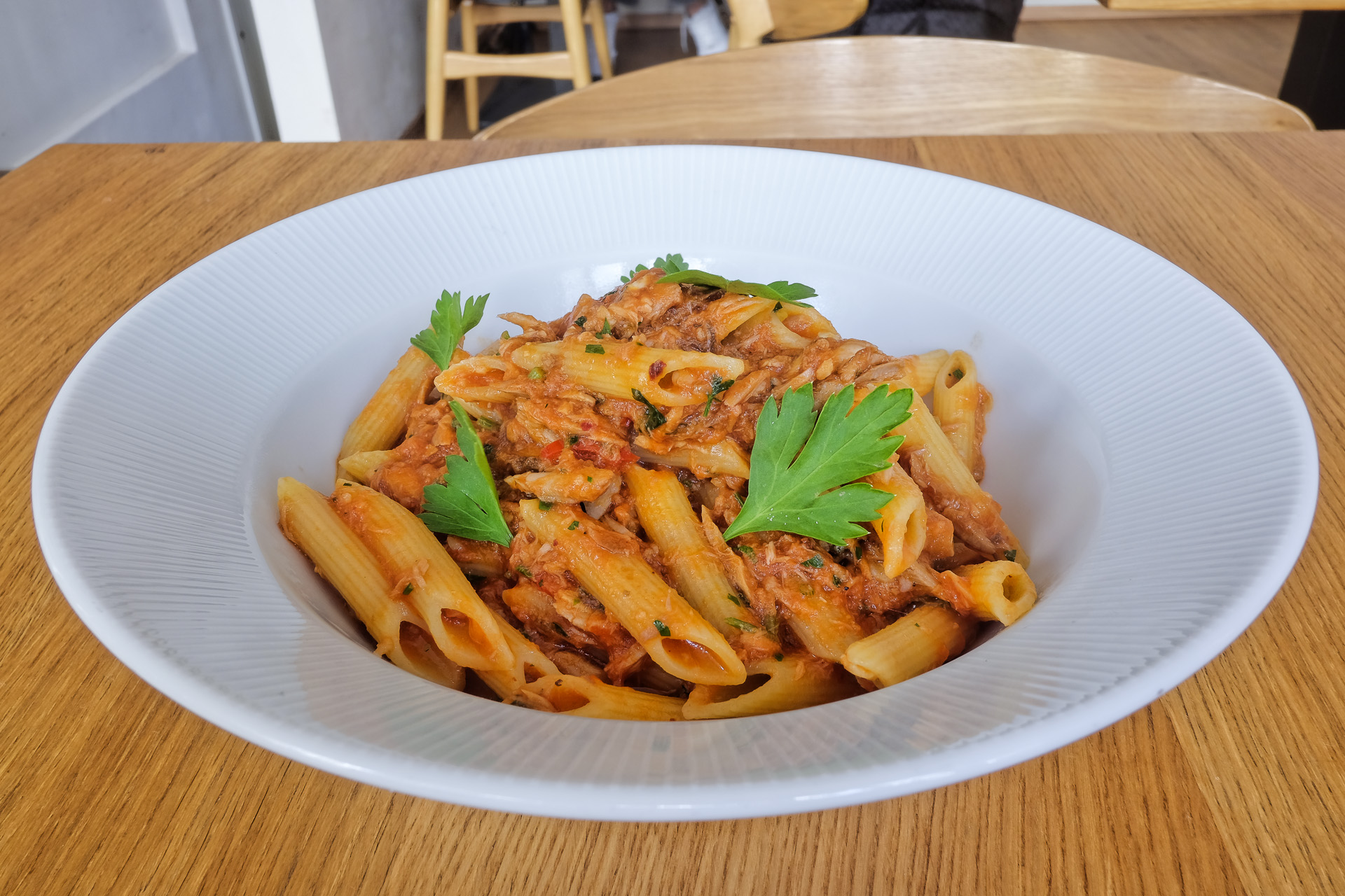 Die Penne waren perfekt al dente, dazu gab es Thunfisch (aus der Konserve), Tomaten, reichlich Knoblauch und etwas Petersilie. Aromatisch und sehr lecker.