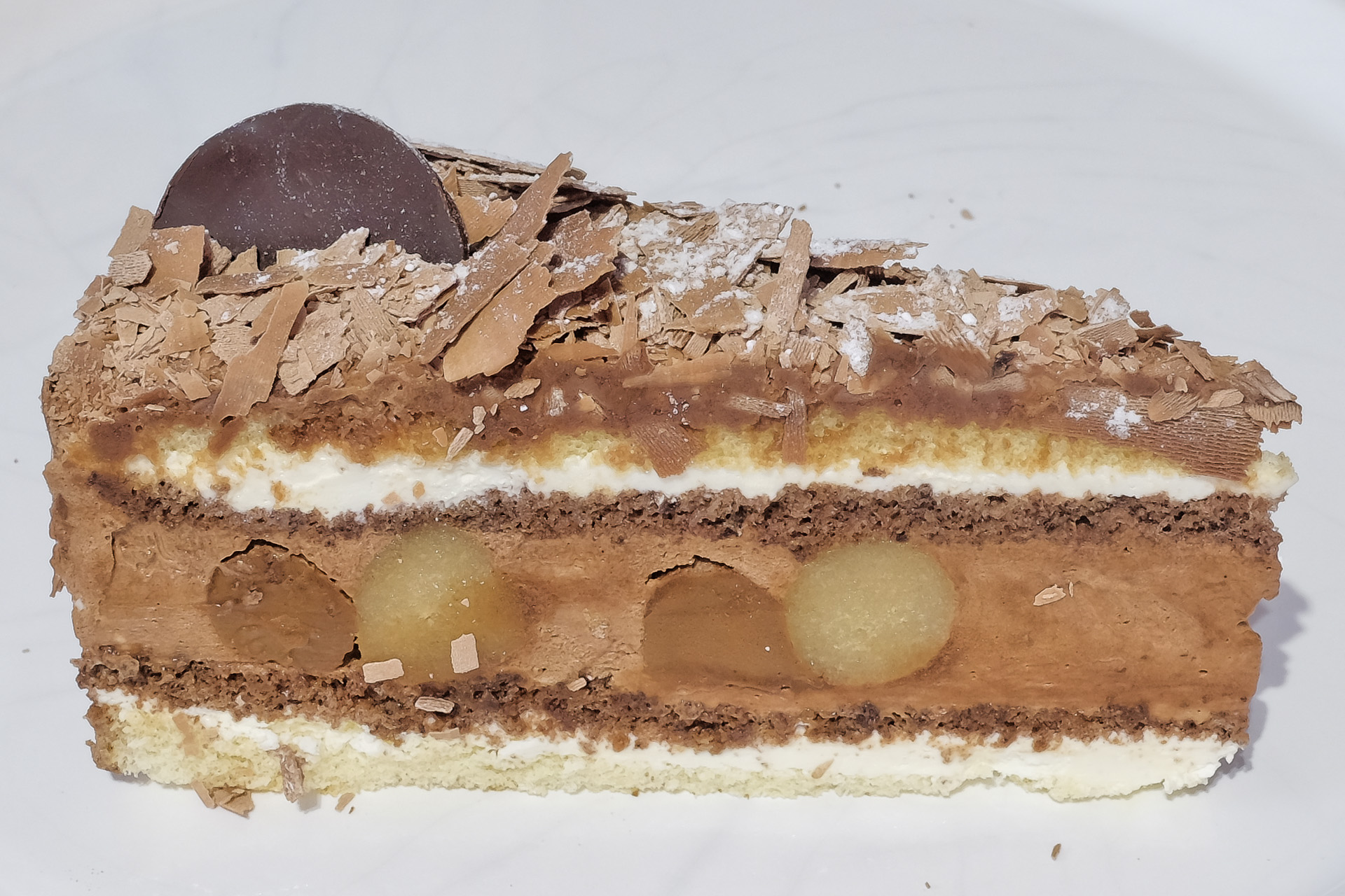 Die Schokoladen Torte wurde aus vielen Schichten aufgebaut, von unten nach oben. Eine dünne Schicht heller Biskuit, eine dünne Schicht helle Buttercreme, eine dünne Schicht Schokoladen Biskuit, eine dicke Schicht Schokoladen / Nougat Buttercreme, eine dünne Schicht Schokoladen Biskuit, eine dünne Schicht helle Buttercreme, dünne Schicht heller Biskuit und oben eine dünne Schicht Schokoladencreme. In der mittleren dicken Schicht waren ringförmig "Würste" aus Nougat und Marzipan eingearbeitet. Sehr lecker.