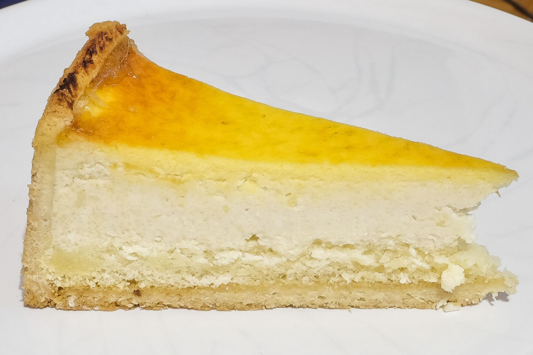 Den Boden bildete eine Schicht Mürbeteig, darüber eine Schicht Biskuit. Der Käsekuchen war recht süß und hatte eine etwas feste stumpfe Textur, er war mit etwas Zitrone aromatisiert. Gerade noch sehr lecker.