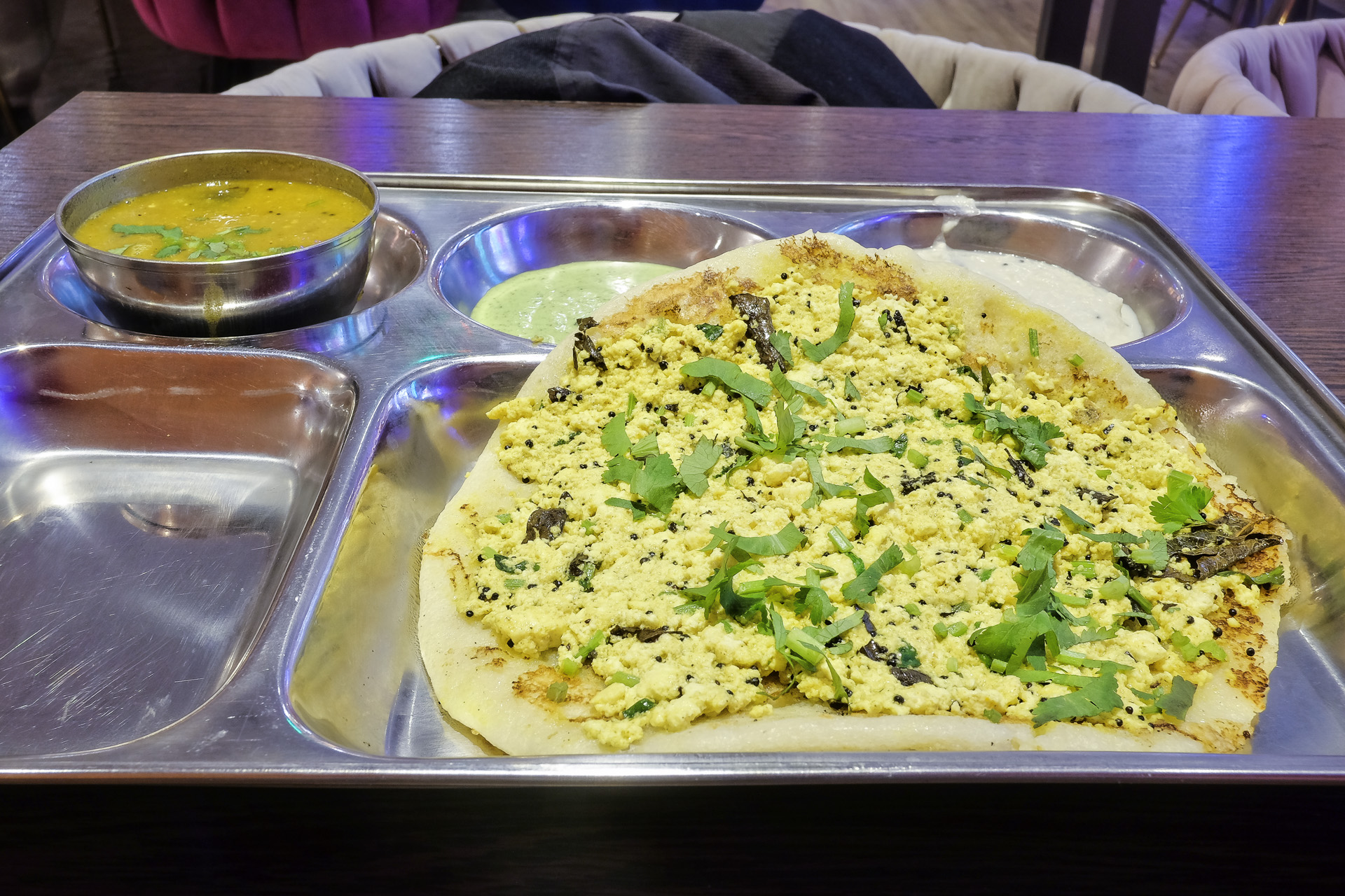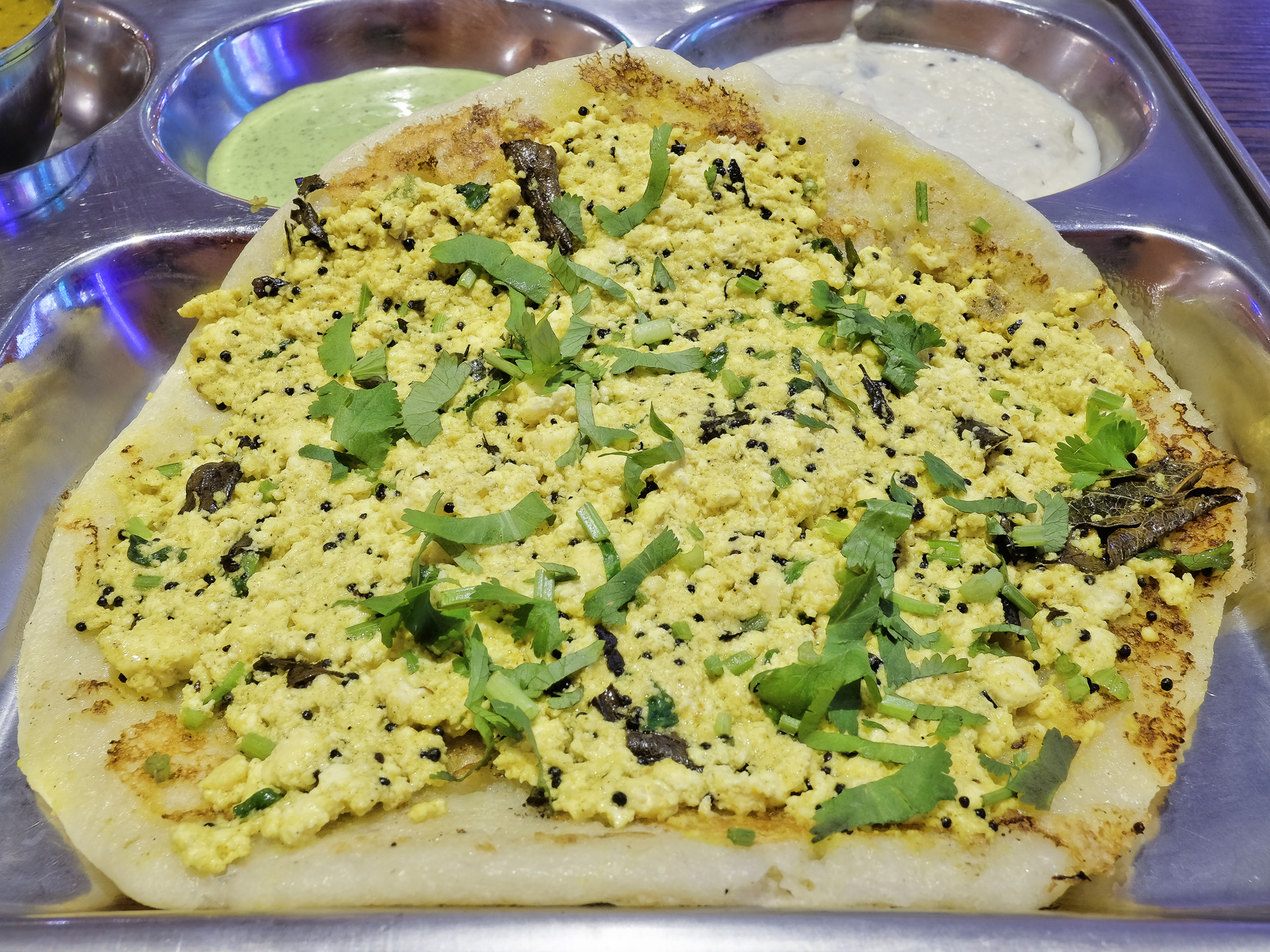 Das Uttapam ist eine Art Pfannkuchen der südindischen Küche auf Basis von Reis, er war weich und locker und hatte ein dezentes Aroma. Bedeckt war er mit krümeligem Paneer Käse und ein paar Kräutern. Sehr lecker.