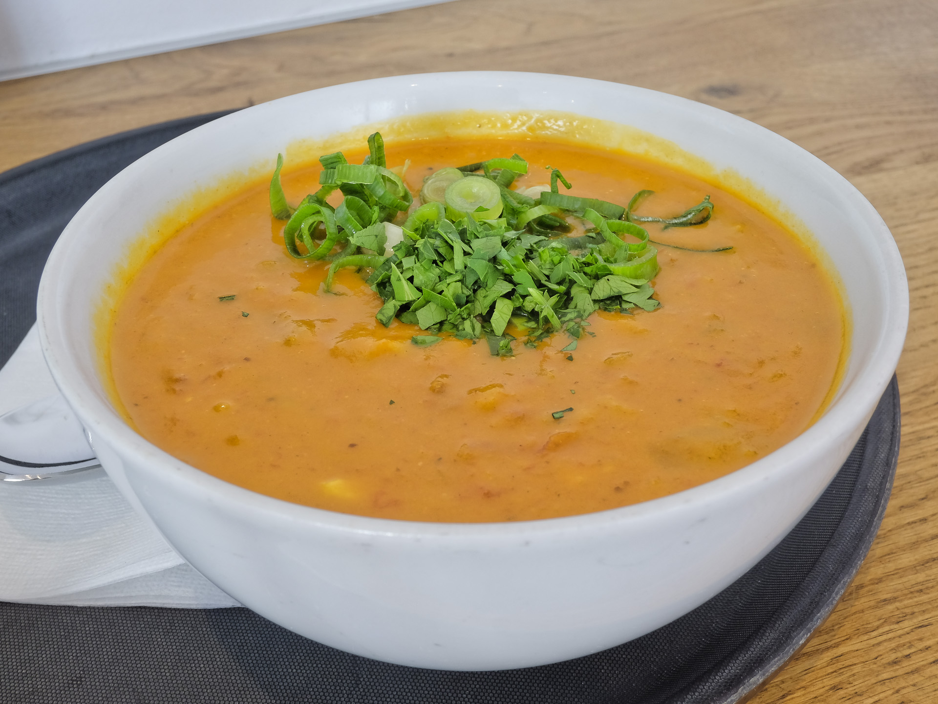 Die Suppe mit Aprikosen und Cashewnüssen hatte eine angenehm cremige Textur, ein feines, leicht süßliches Aroma und eine pikante Schärfe. Sehr lecker, Klasse.