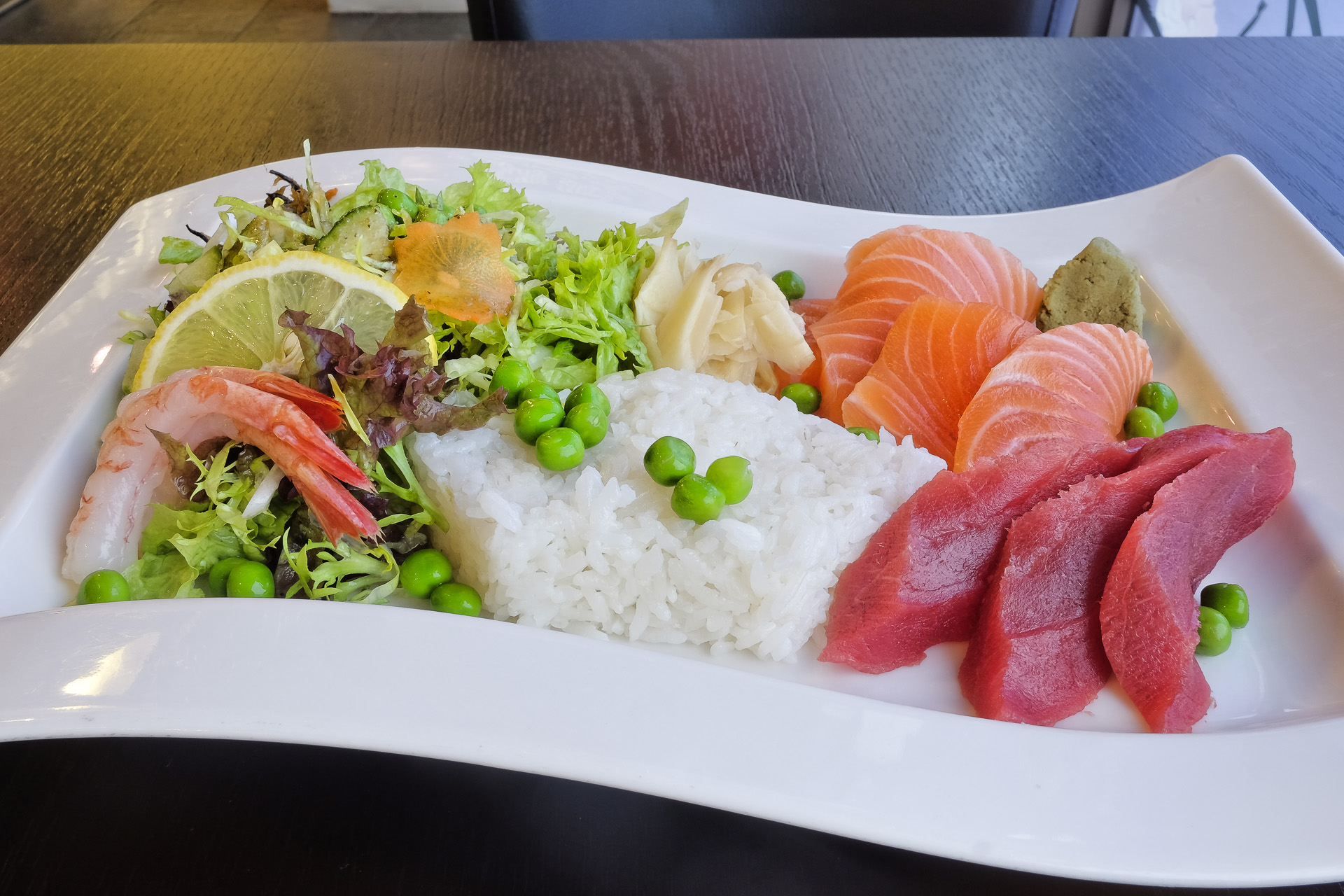 Der Lachs war zart mit perfekter Textur und hatte ein feines Aroma (Klasse). Der Thunfisch war zart aber leicht mehlig, davon hatte ich mir mehr versprochen (gerade noch sehr lecker). Die rohen Garnelen hatten eine sehr zarte Textur un ein feines Aroma (sehr lecker). Dazu gab es Sushireis, Wasabi, Gari (eingelegter Ingwer), aromatische Erbsen und einen gemischten Salat. Sehr lecker.