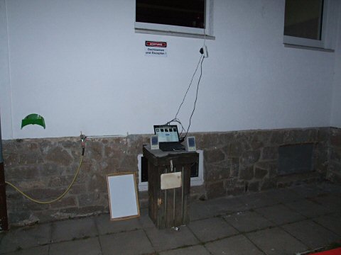 Da es Draußen keine Steckdose gab mußten wir etwas improvisieren um Musik zu hören. So haben wir das Labtop von Markus auf die Mülltonne gestellt. Das Kabel reichte gerade bis zur Steckdose im Aufenthaltsraum.