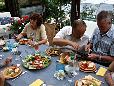 Das Abendessen fand wieder im Wintergarten statt. Es gab Antipasti mit Weißbrot und anschließend Reis mit Huhn.