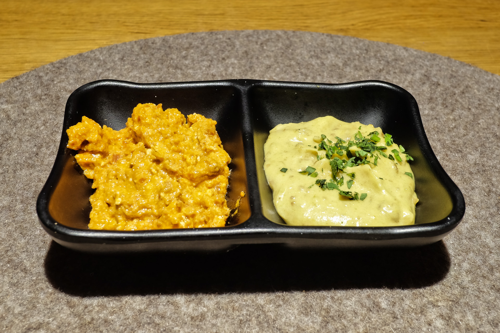 Dazu gab es einen Curry Dattel und einen Tomaten Feta Dip. Beide hatten eine zart cremige Textur und waren fein abgeschmeckt, sehr lecker, eine positive Überraschung.