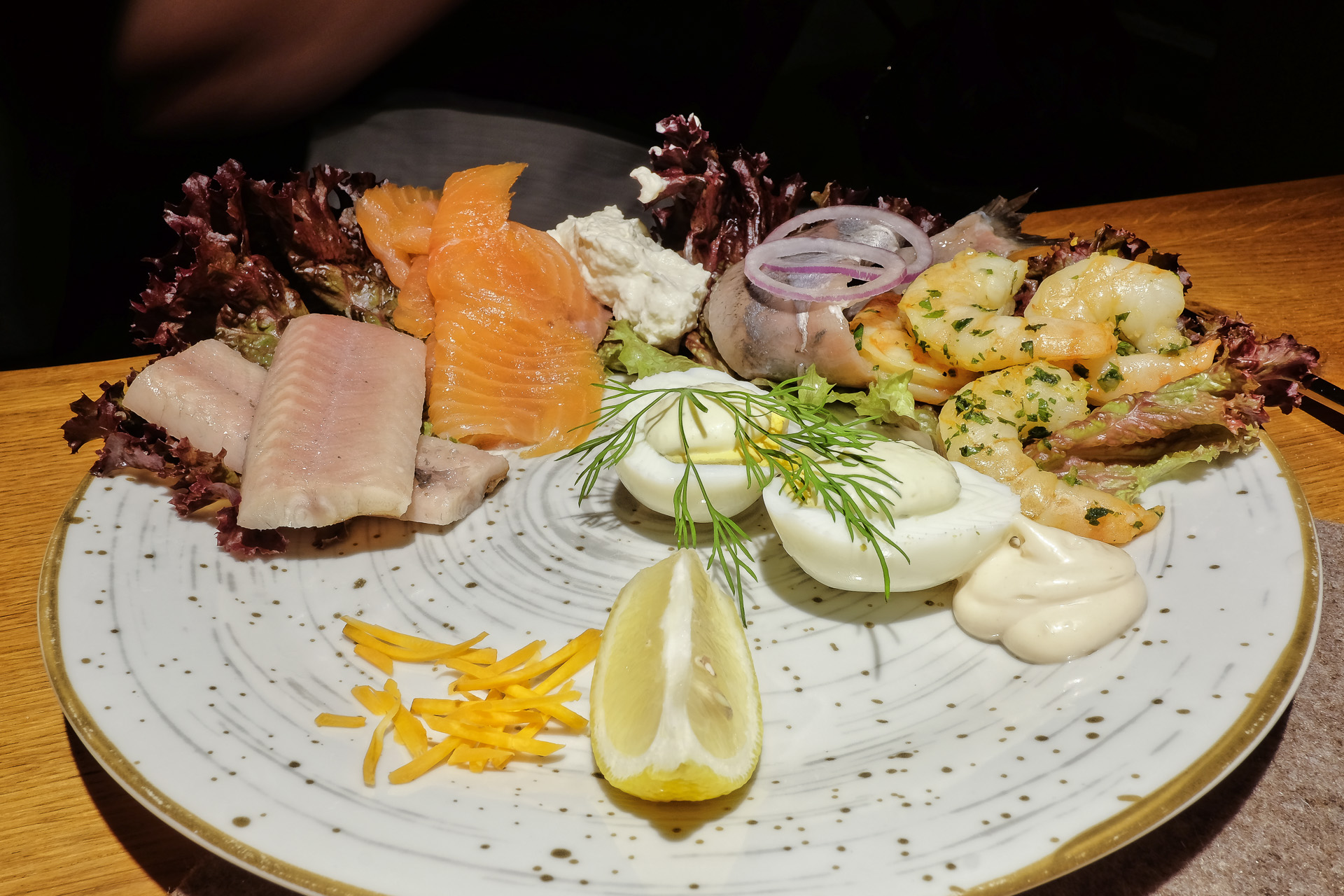 Räucheraal, Räucherlachs, marinierte Garnelen, Matjesfilets und Ei mit Bratkartoffeln