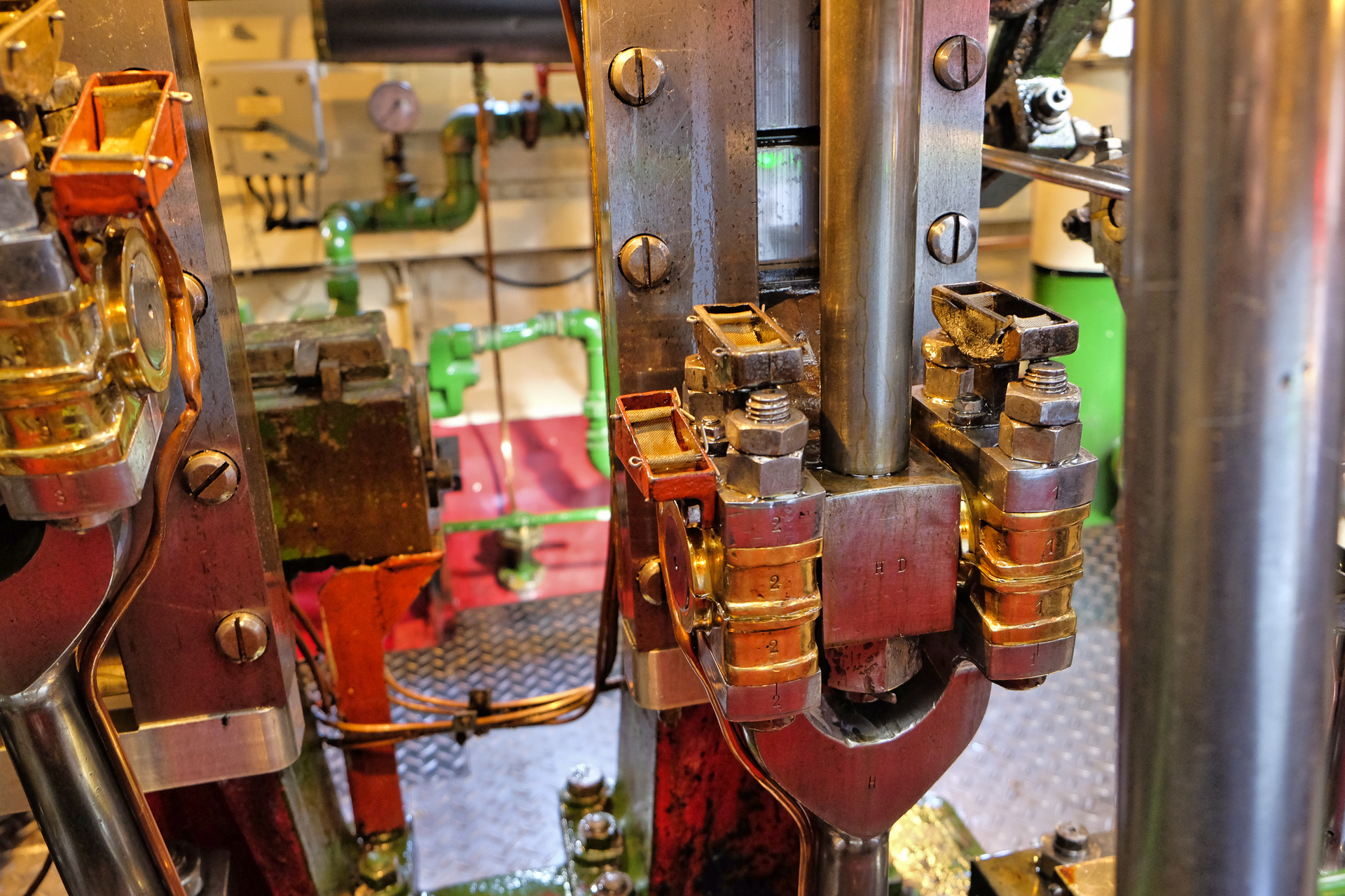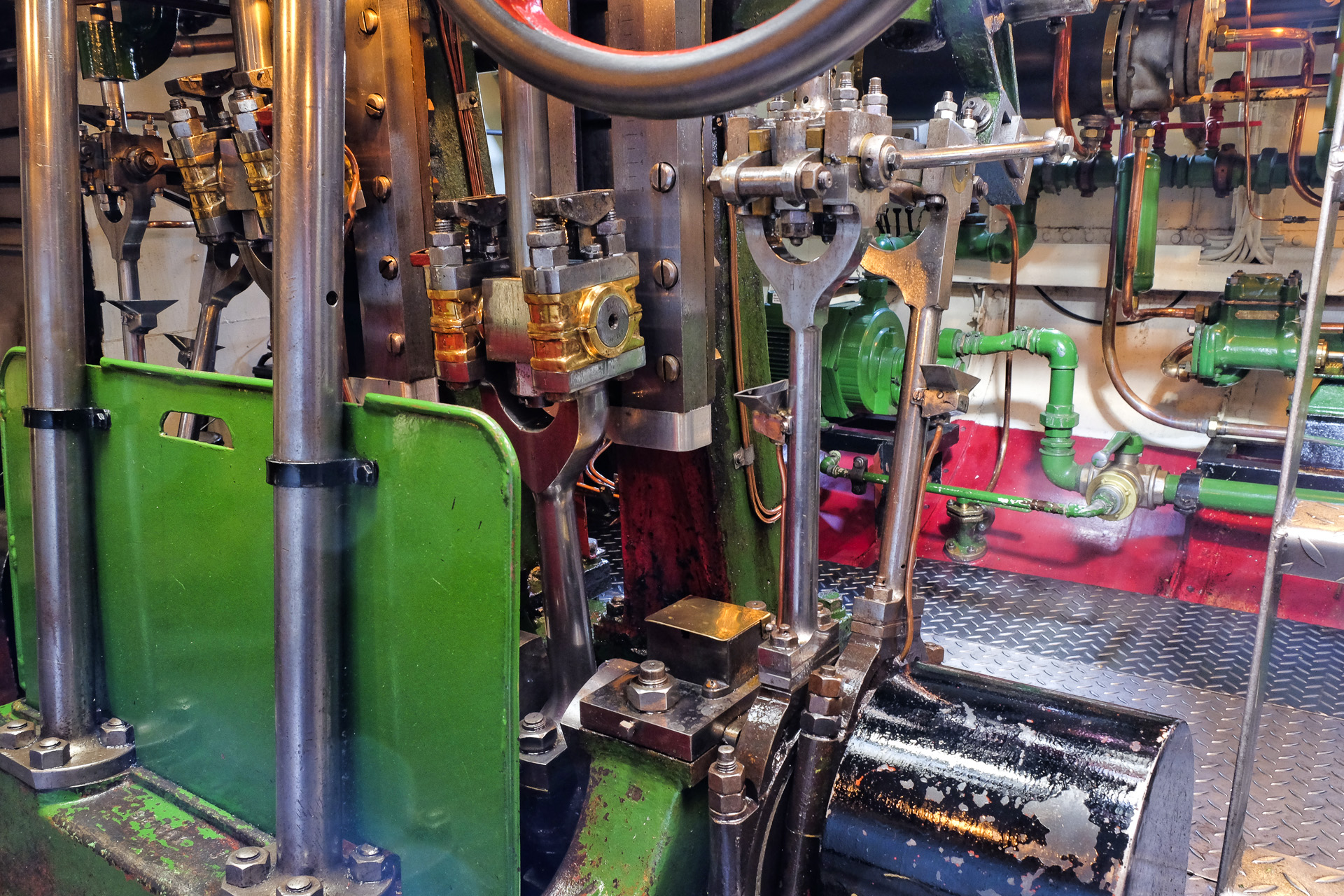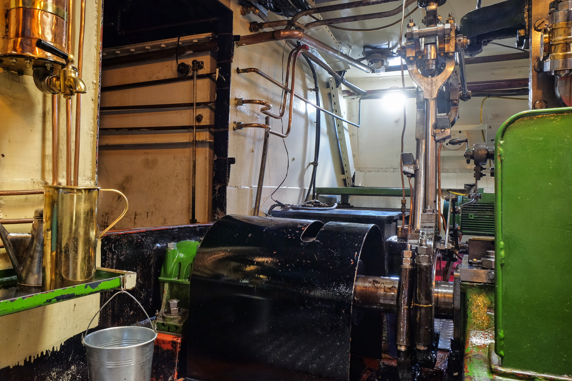 Durch offene Luken kann man einen Blick auf die Maschinenanlage werfen. Die 2 Zylinder Dampfmaschine stammt aus dem Jahr 1922 und leistet 75 PS.