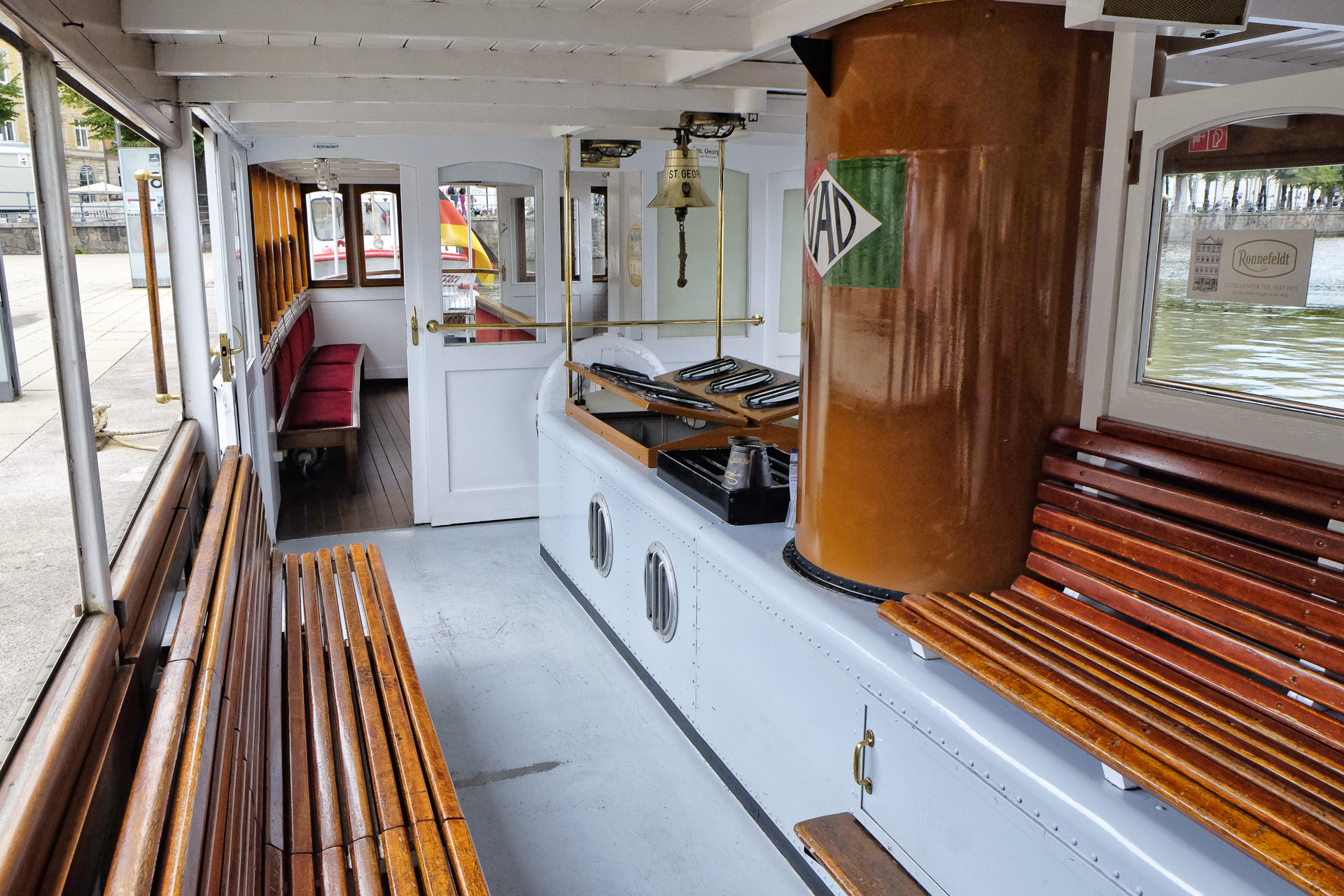 Eine steile Treppe führt in den Maschinenraum. Als Besucher kann man ihn besichtigen, während der Fahrt mit dem Maschinisten.