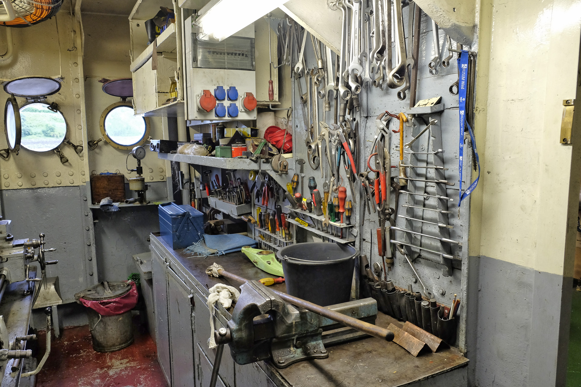 Im Maschinenraum gibt es auch eine kleine Werkstatt mit einer Drehbank.