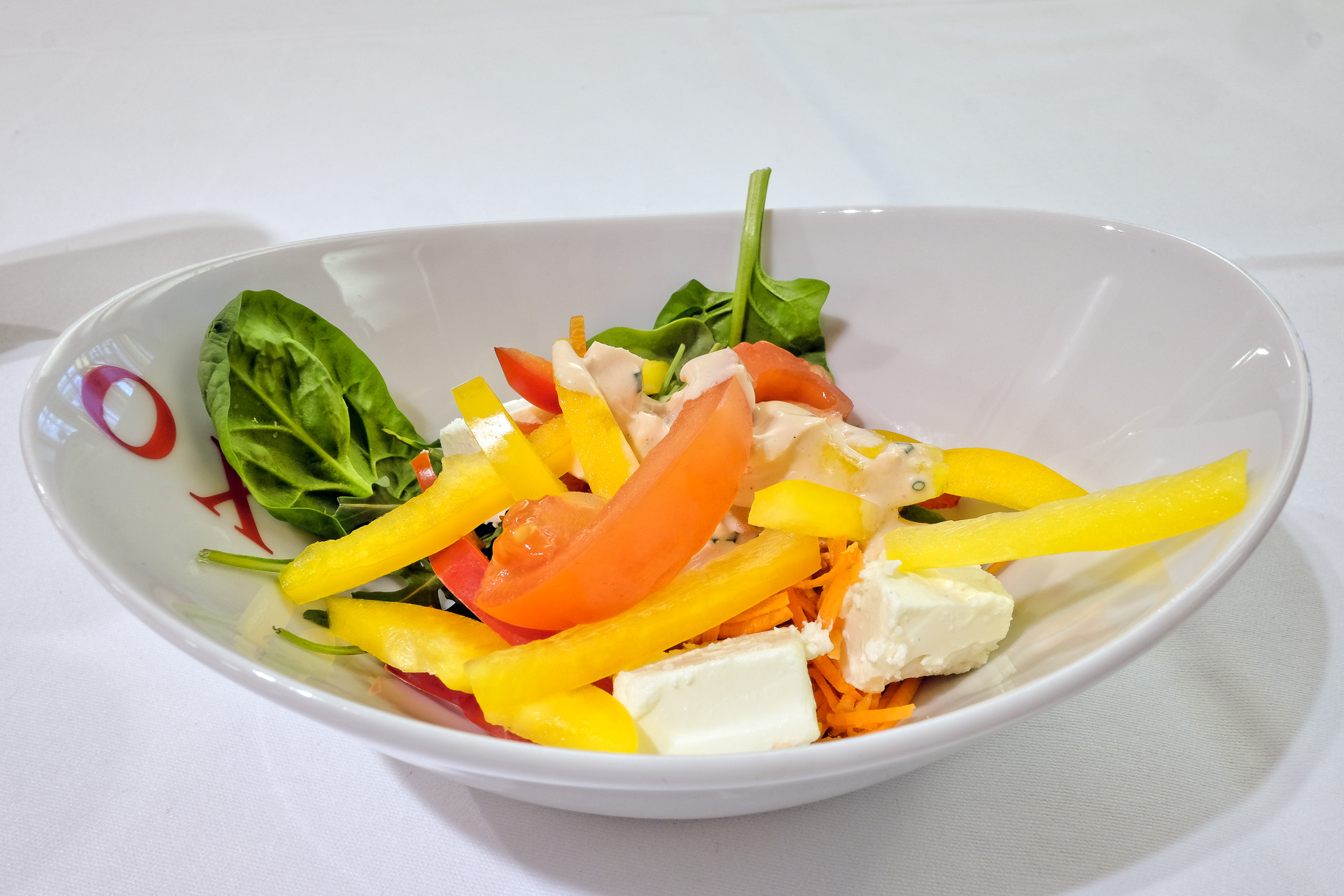 Dazu gab es noch einen Salat den ich mir am Buffet selbst zusammenstellen konnte. Rote und gelbe Paprika, Tomaten, Karotten, Rucola, Spinat, Feta und ein Ranch Dressing. Alles frisch und knackig, sehr lecker.
