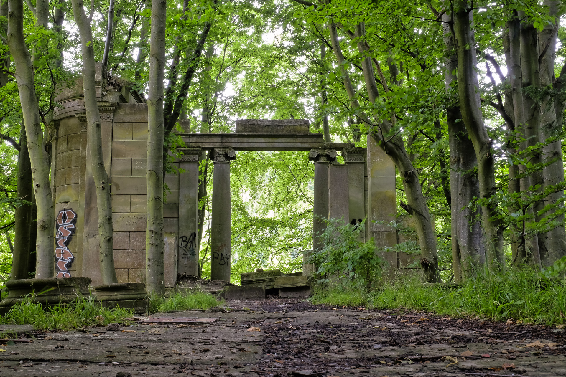 Ein schmaler Weg führt durch den Wald zum Schloss und zu einer ehemaligen NVA Kaserne.