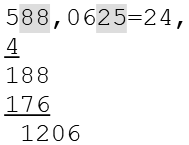 Dies ist hier 5 mal der Fall, die 5 ist daher die nächste Ziffer des Ergebnisses. Jetzt müssen wir den Subtrahend berechnen, die Berechnung erfolgt wieder nach dem gleichen Schema. Die ermittelte Zahl (5) wird zum Teiler (4840) addiert, das Ergebnis wird mit der ermittelten Zahl (5) multipliziert. So erhalten wir 24225.