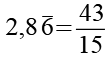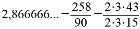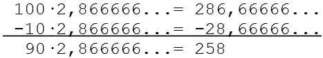 Dieser Lösungsweg läßt sich auch einfacher darstellen. Wir benutzen dazu die Schreibweise bei der die Periode durch einen Überstrich markiert ist. Auf den Bruchstrich schreibt man die komplette Zahl ohne Komma (286). Davon wird die Zahl ohne die Periode (28) abgezogen. Die Länge der Periode beträgt bei diesem Beispiel 1, dafür schreiben wir eine 9 in den Nenner (bei einer Periodenlänge von 3 wäre es dann 999). Unsere Zahl hat hinter dem Komma eine Ziffer (8) die nicht zur Periode gehört, dafür schreiben wir eine 0 in den Nenner.